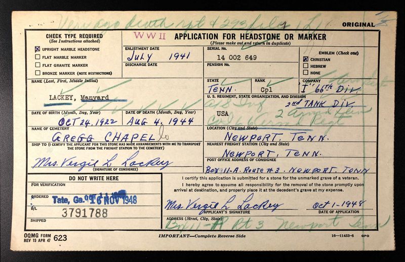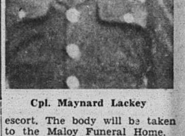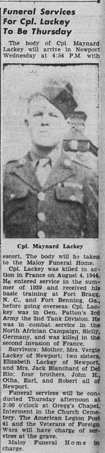 The body of Cpl. Maynard Lackey will arrive in Newport Wednesday with escort. The body will be taken to the Maloy Funeral Home. Cpl. Lackey was killed in action in France on August 4, 1944. He entered service in the summer of 1939 and received his basic training at Fort Bragg, N.C. and Fort Benning, Ga., before going overseas. Cpl. Lackey was in Gen. Patton’s 3rd Army the 2nd Tank Division. He was in combat service in the North African Campaign, Sicily, Germany and was killed in the second invasion of France.