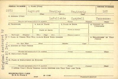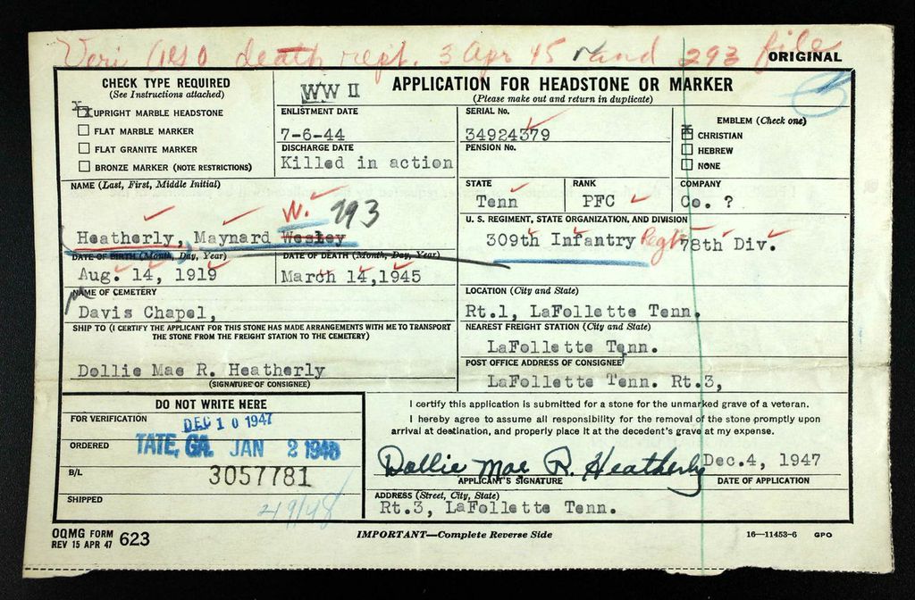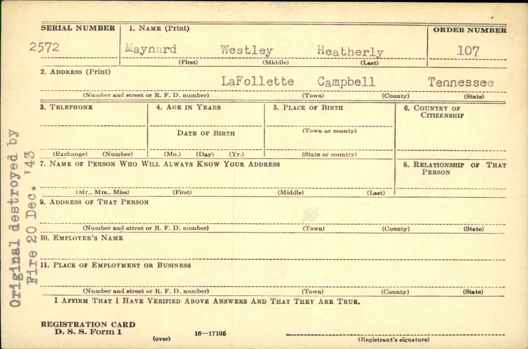 Maynard Westley Heatherly was born on 14 August 1919, the son of Andrew J. “Andy” Heatherly and Surreptia Maggie Jones. Husband of Dollie Mae Renfro and Billie Glenn Heatherly and Anna Faye Heatherly.