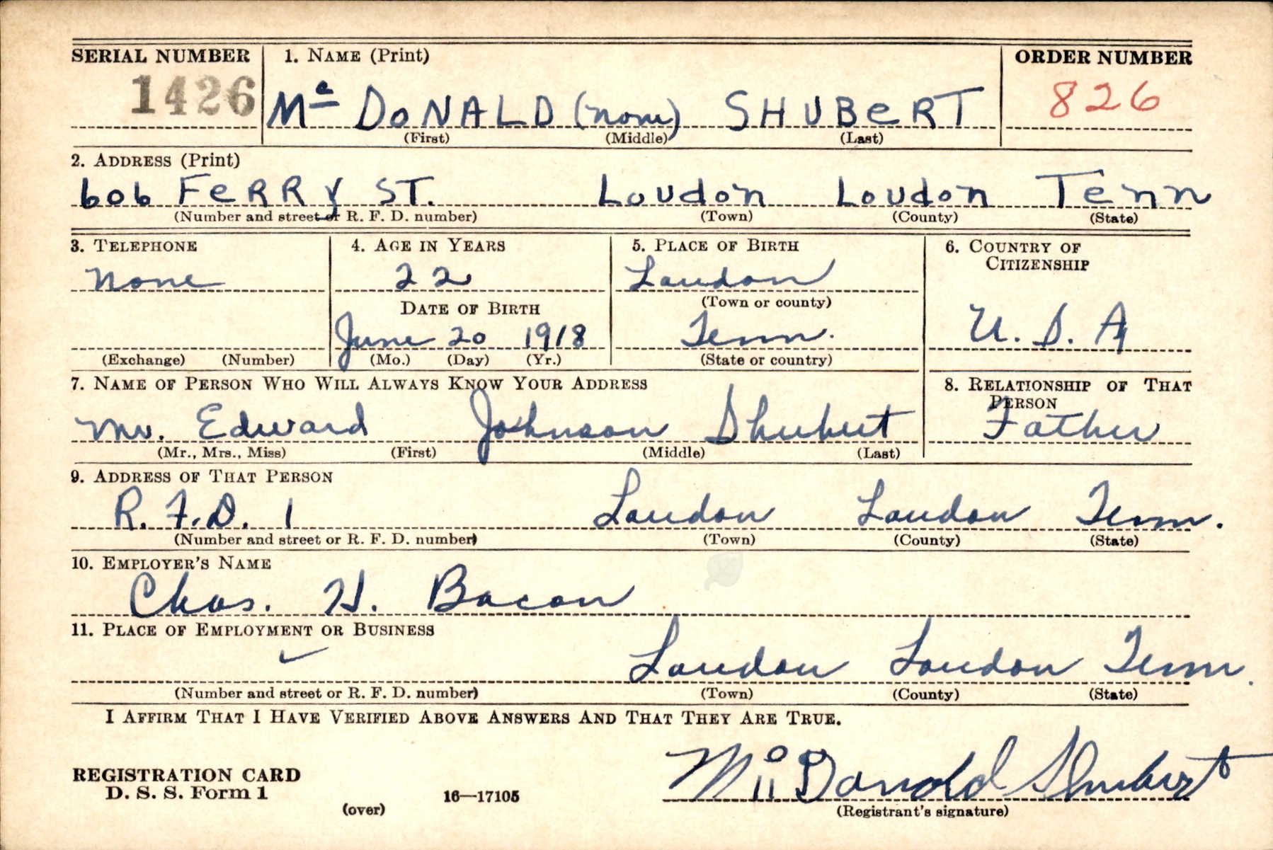 McDonald Shubert was born on 20 June 1918. He was the son of Edward Johnson Shubert and Virgie Scott. He was married with Frances H. Thompson and father of Joyce Bernice Shubert and James E. Shubert.