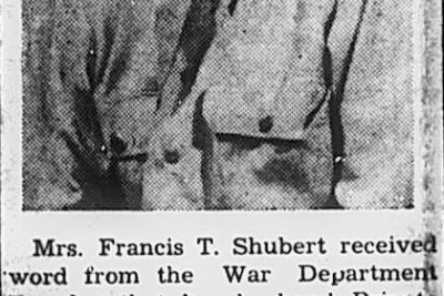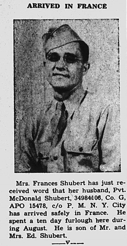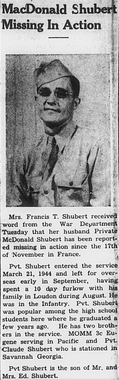 Mrs. Francis T. Shubert received word from the War Department Tuesday that her husband, Private McDonald Shubert, has been reported missing in action since the 17th of November in France. Pvt. Shubert entered the service March 21, 1944 and left for overseas early in September, having spent a 10 day furlow with hsi family in Loudon during August. He was in the Infantry. Pvt. Shubert was popular among the high school students here where he graduated a few years ago. He has two brothers in the service, MOMM3c Eugene serving in the Pacific, and Pvt. Claude Shubert who is stationed in Savannah, Georgia. Pvt. Shubert is the son of Mr. and Mrs. Ed. Shubert.