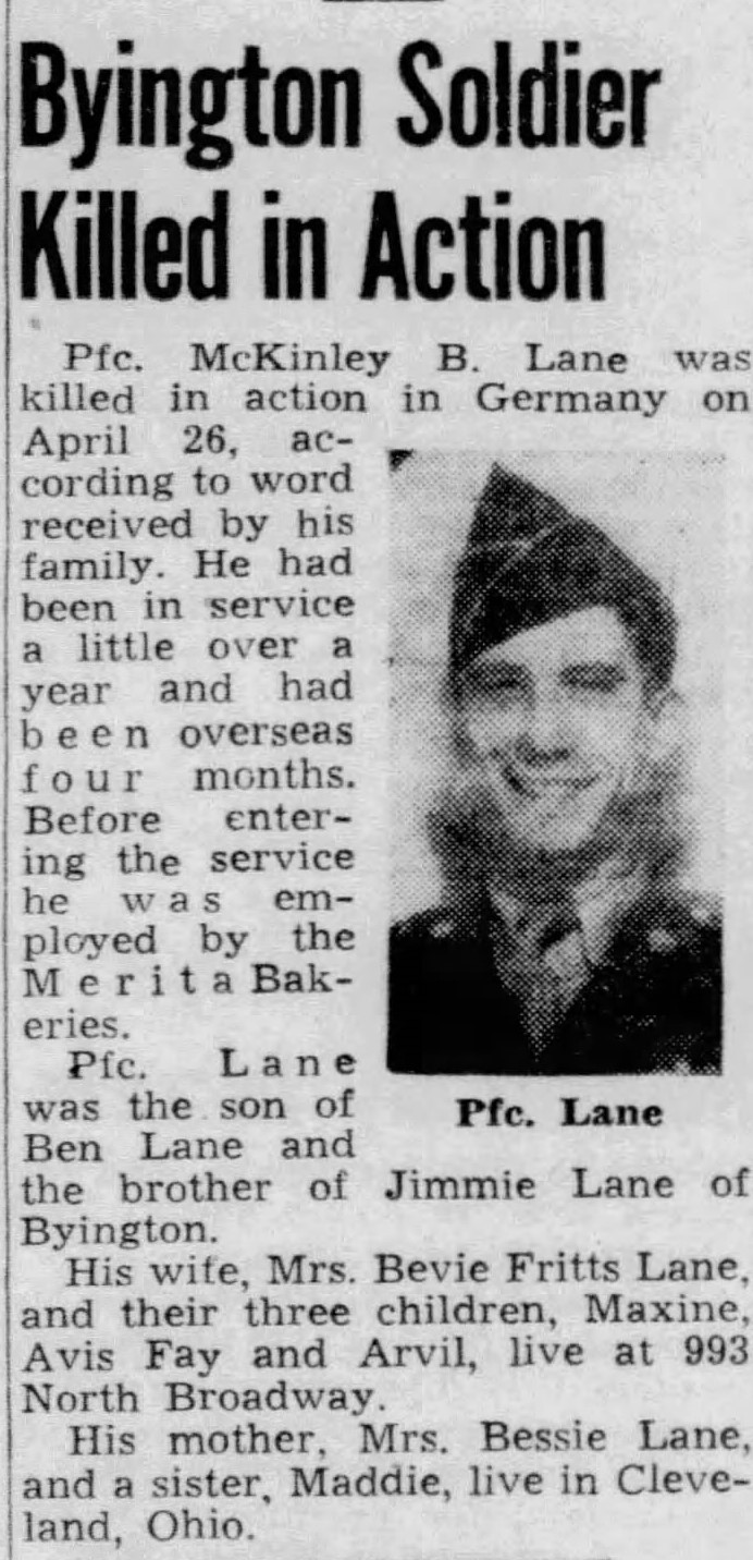 Pfc. McKinley B. Lane was killed in action in Germany on April 26, according to word received by his family. He had been in service a little over a year and had been overseas four months. Before entering the service he was employed by the Merita Bakeries. Pfc. Lane was the son of Ben Lane and the brother of Jimmie Lane of Byington. His wife, Mrs. Bevie Fritts Lane, and their three children, Masine, Avis Fay and Arvil, live at 993 North Broadway. His mother, Mrs. Biessie Lane, and a sister, Maddie, live in Cleveland, Ohio.