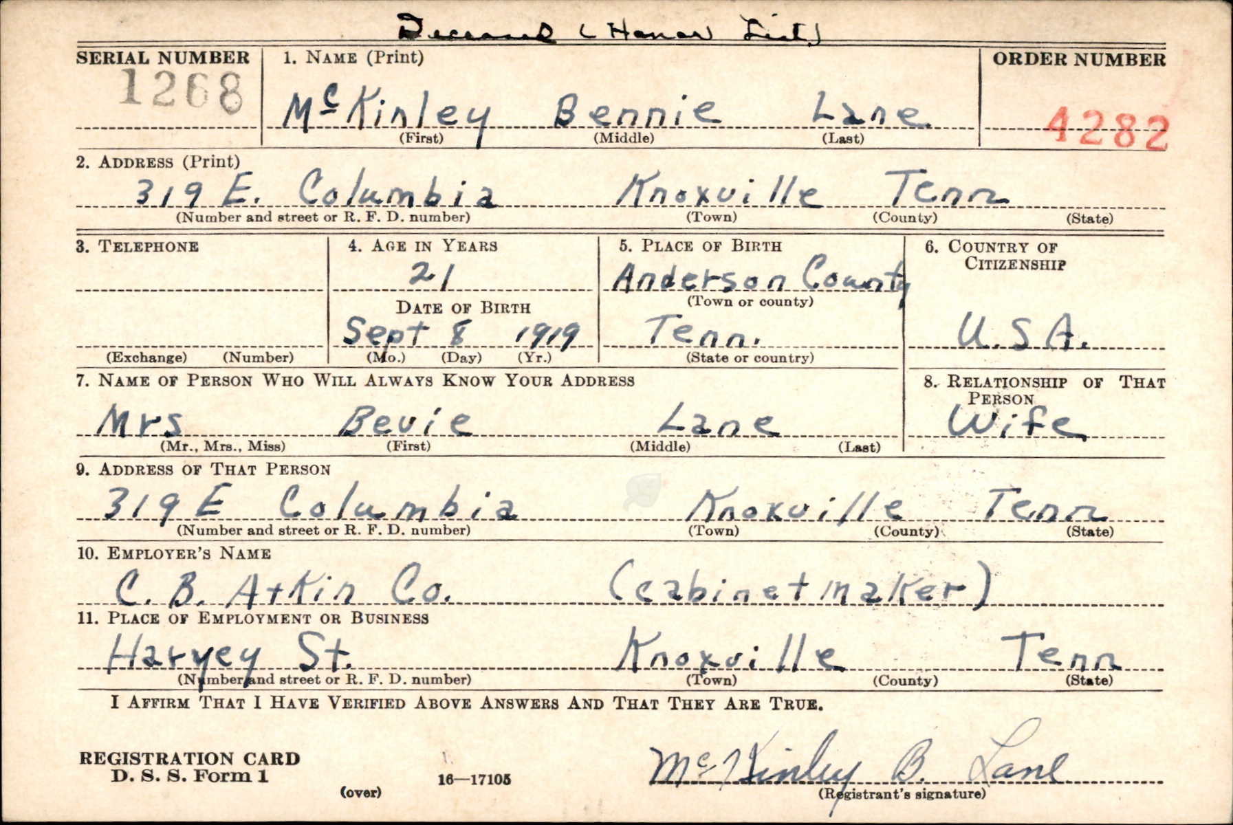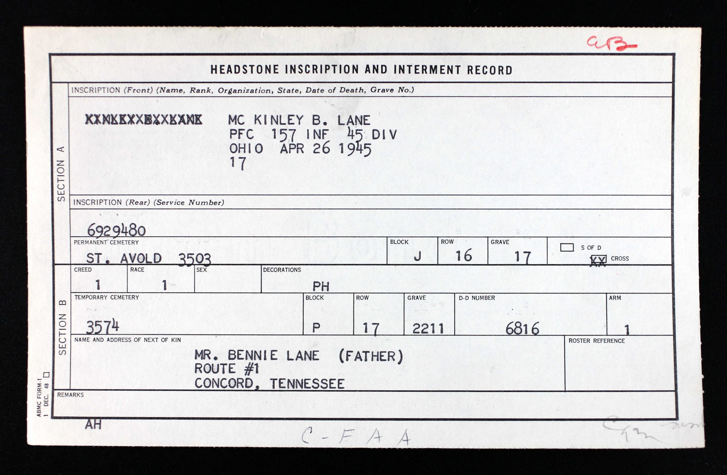 McKinley Bennie Lane was born in Anderson County, Tennessee. Pfc Lane was the son of Ben and BessieLane and brother of Jimmie Lane and Maddie Lane. He was married to Bevie Fritts and they had three children, Maxine, Avis Fay and Arvil Lane.