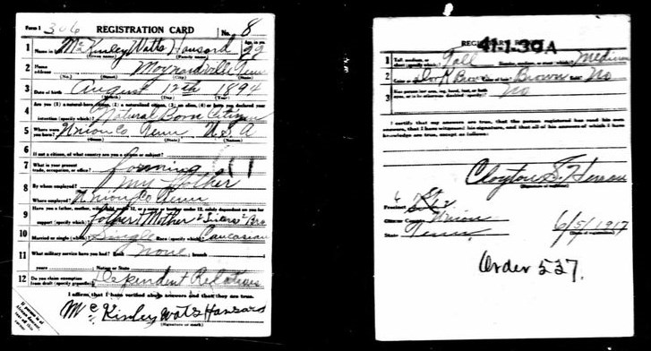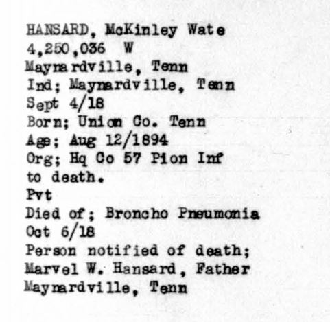 McKinley Hansard age 23 years, a member of the National Army who was training at Camp Merritt, N.J. died Sunday. He was a son of M.W. Hansard. The young man was taken by the selective draft, September 4. The deceased is survived by his parents, five sisters, and seven brothers, two sisters, Willie and Canditia reside in Lakeland, Fla. Two brothers, Pryor and Albert are in the army, the former being in France. Albert is at Camp Gordon. The other brother and sisters live in Knox County, The body will be brought to Knoxville and the funeral will be conducted at Hansard’s chapel. The funeral arrangements will appear later.