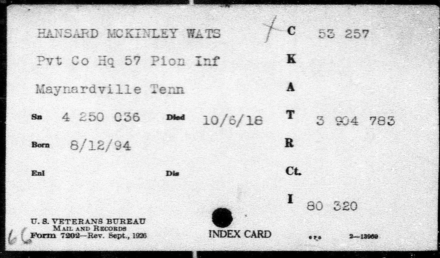 McKinley Watts Hansard was born 12 August 1894, Union County, Tennessee, son of Marvel Witt Hansard. He died of broncho pneumonia.