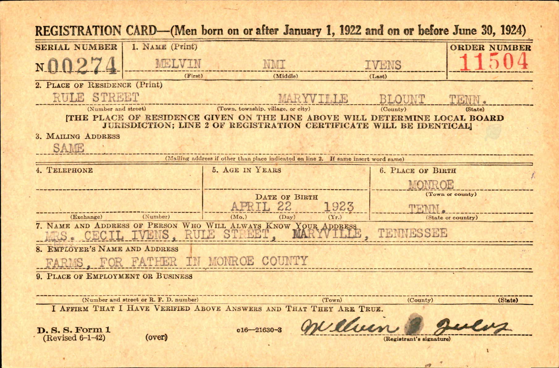 Melvin was the son of Mr. and Mrs. James H. Ivens. He leaves to mourn his departure his parents, four sisters, Mrs. Geneva Reno, Misses Onie Bee, Ruby and Carolyn Ivens, three brothers, Winfred, Randall and Bobby, a grandfather, Mr. Sherman Cole, two grandmothers, Mrs. Sherman Cole and Mrs. Maggie Ivens, several other relatives and a host of friends.