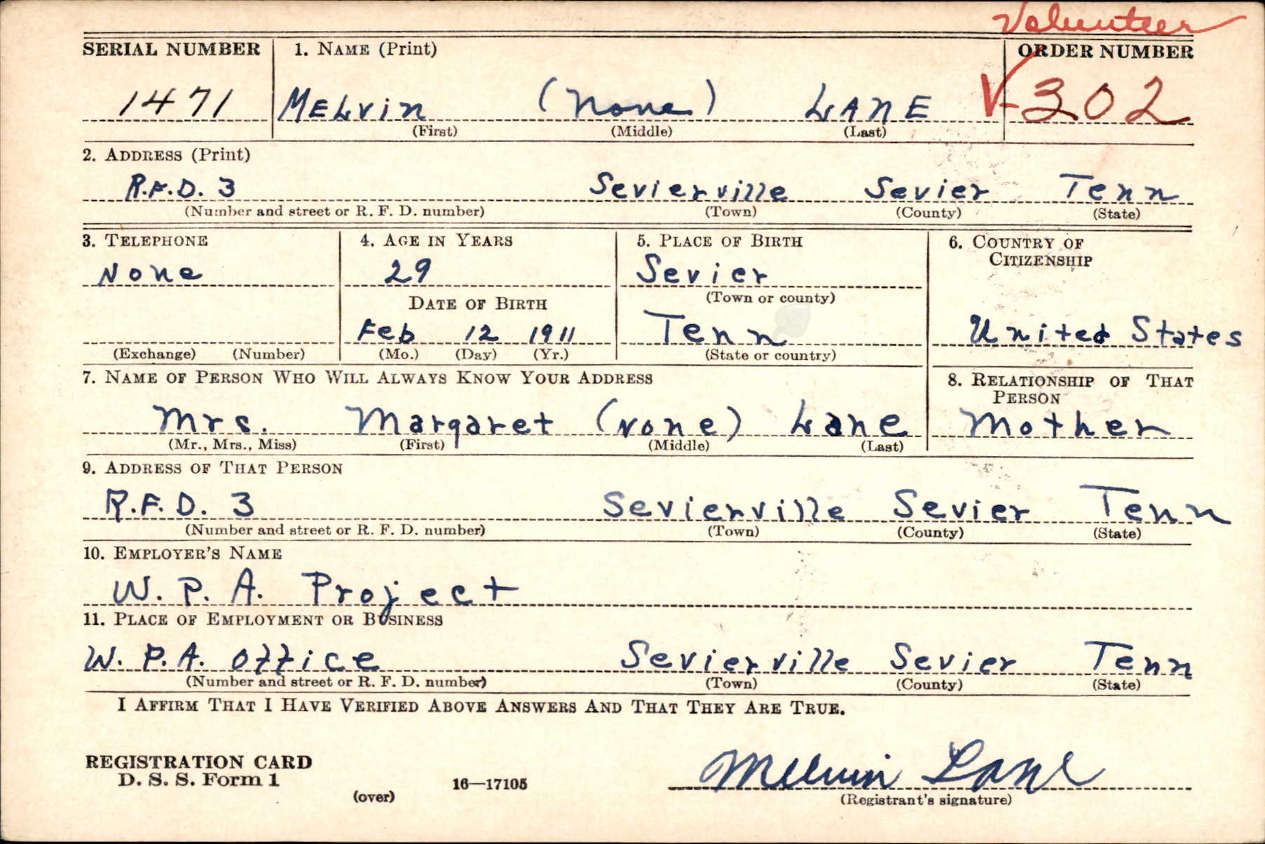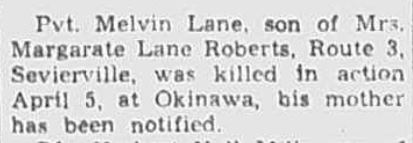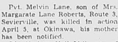Melvin Lane entered the service in November, 1943. He had been overseas two years and died of Wounds at Okinawa. He was the son of Margarate Lane Roberts of Route 3, Sevierville.