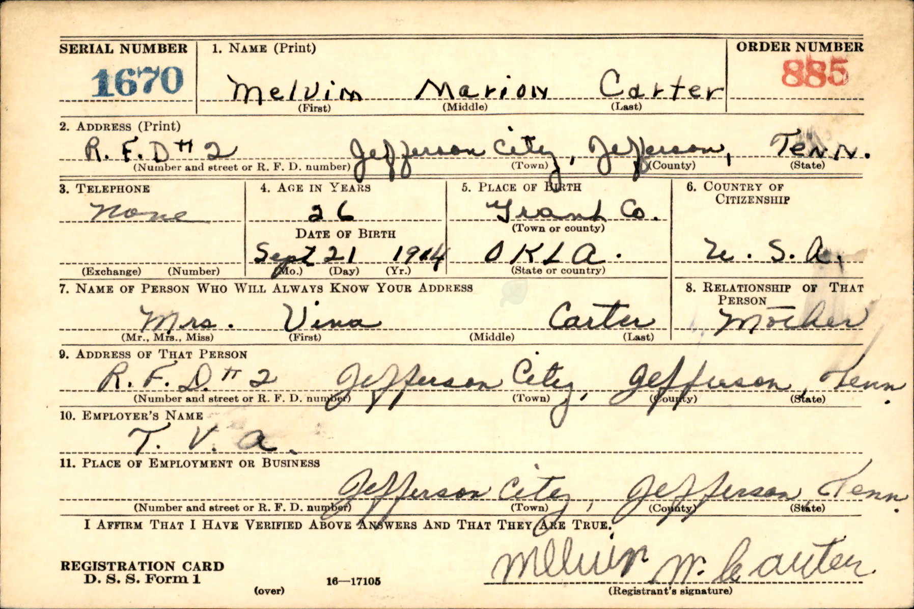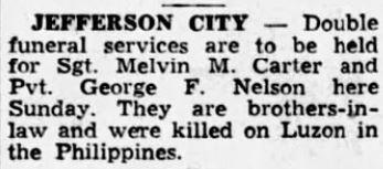 Melvin Marion Carter was born on 21 September 1914, Oklahoma, the son of William Spurgeon Carter and Lavina Ellen Strait. Brother in Law of Pvt. George Francis Nelson who also died on Luzon.
