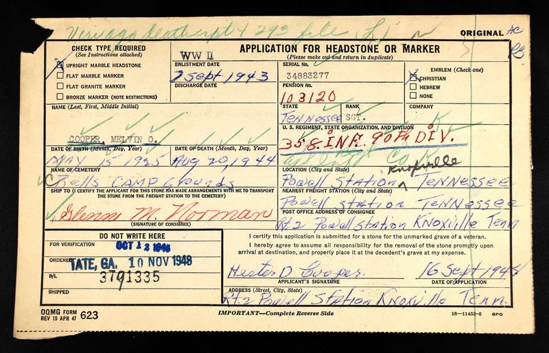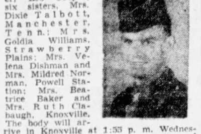 Sgt. Melvin O. Cooper was killed in action while serving with the 90th Infantry Division in France, Aug. 20, 1944. He was a former employe of Brookside Mills. Survivors: parents; brothers, Leo Cooper; six sisters, Mrs. Dixie Talbott, Manchester, Tenn.; Mrs. Goldia Williams, Strawberry Plains; Mrs. Velena Dishman and Mrs. Mildred Norman, Powell Station; Mrs. Beatrice Baker and Mrs. Ruth Clabaugh, Knoxville.