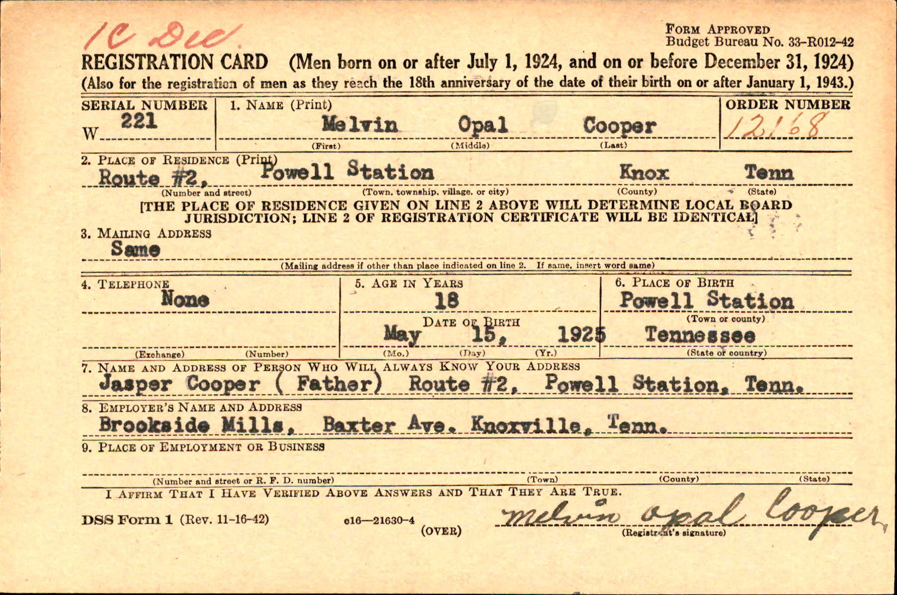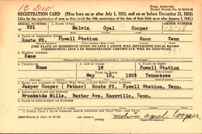 Melvin Opal Cooper was born on 15 May 1925 at Powell Station, Tennessee, to Jasper “Jap” Cooper and Hester Ann Dishmon.