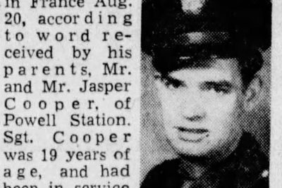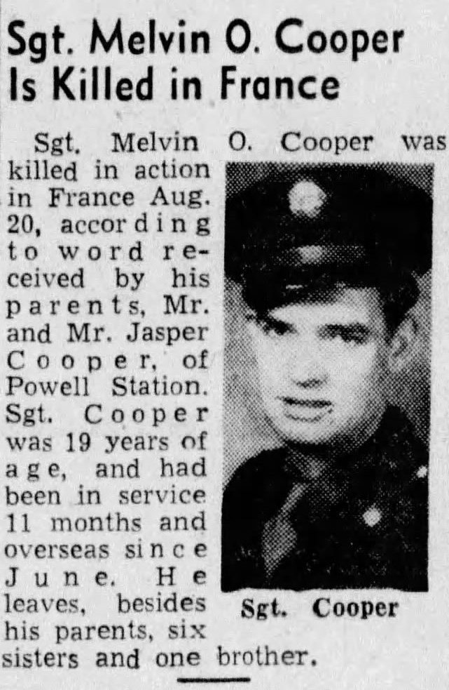 Sgt. Melvin O. Cooper was killed in action in France Aug. 20, according to word received by his parents, Mr. and Mrs. Jasper Cooper, of Powell Station. Sgt Cooper and had been service 11 months and overseas since June. He leaves, besides his parents, six sisters and one brother.