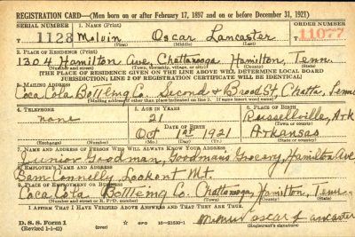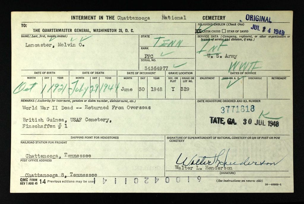 Pfc. Melvin O. Lancaster, son of Mr. and Mrs. Ike Lancaster, Route 5, Signal Mountain. He was a member of an infantry unit and reported killed in action in New Guinea July 29, the War Department informed his family. He entered the army two years ago and had been overseas since February, 1943. Prior to army duty, he was employed by the Coca-Cola Company in Chattanooga.