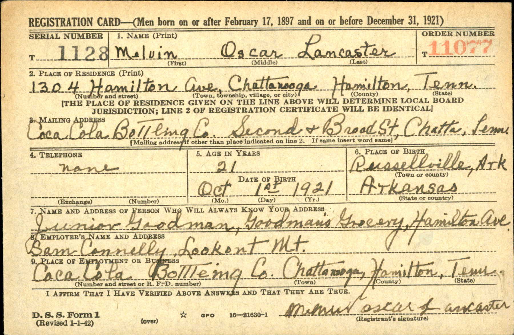 Melvin Oscar Lancaster was born on 1 October 1921 at Russellville, Arkansas to Isaac Melvin Lancaster and Cora Jane Barnett.