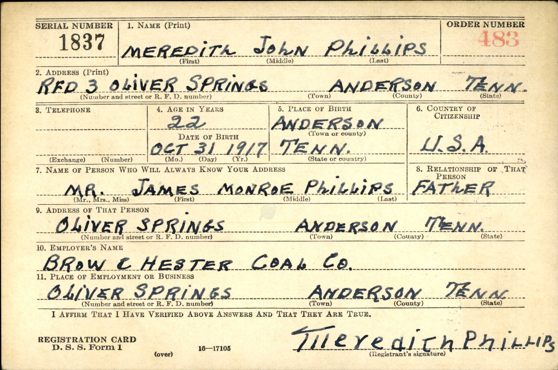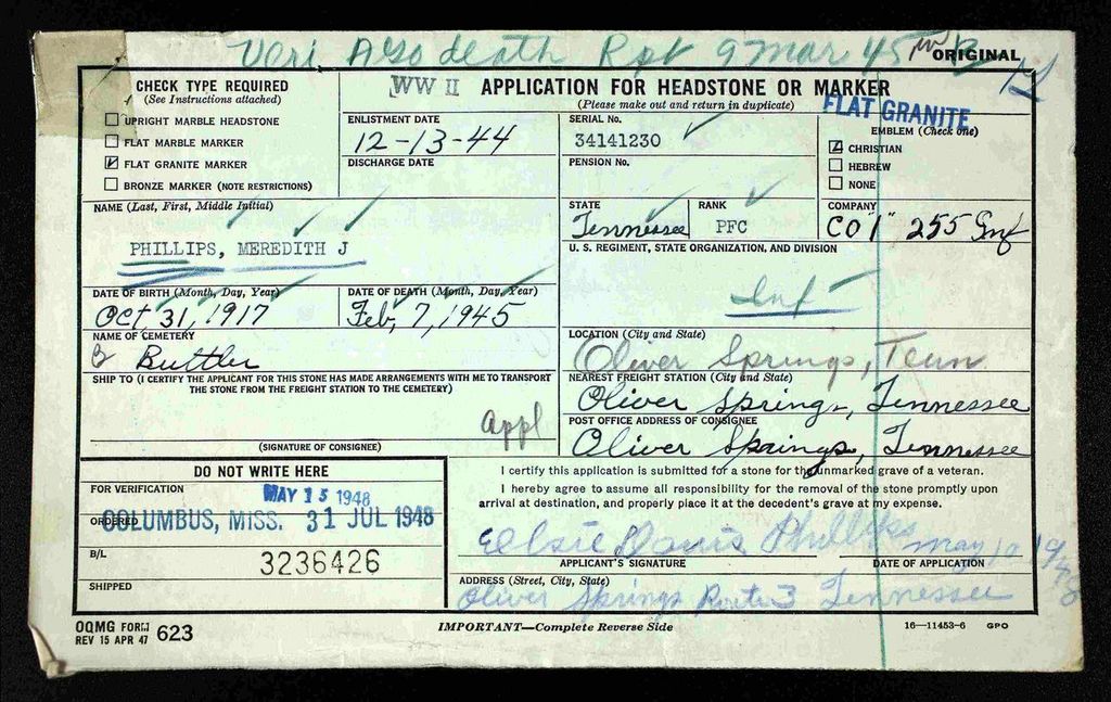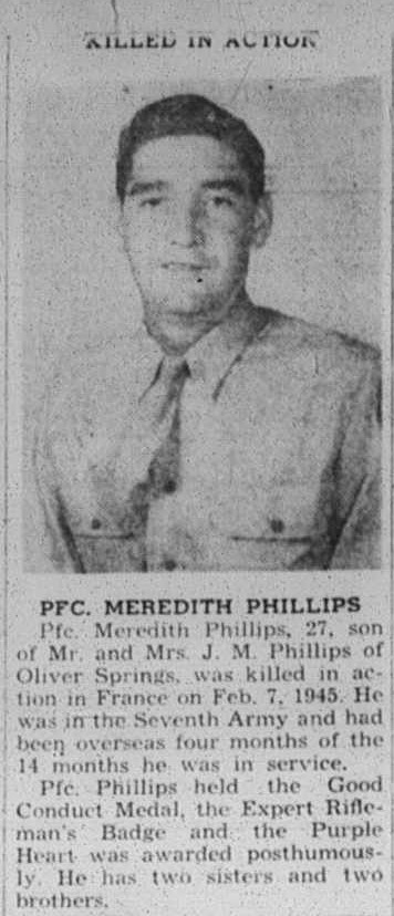 Pfc. Meredith Phillips, 27, son of Mr. and Mrs. J.M. Phillips of Oliver Springs, was killed in action in France on Feb. 7, 1945. He was in the Seventh Army and had been overseas four months of the 14 months he was in service.