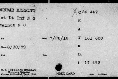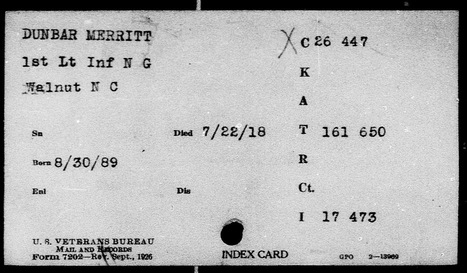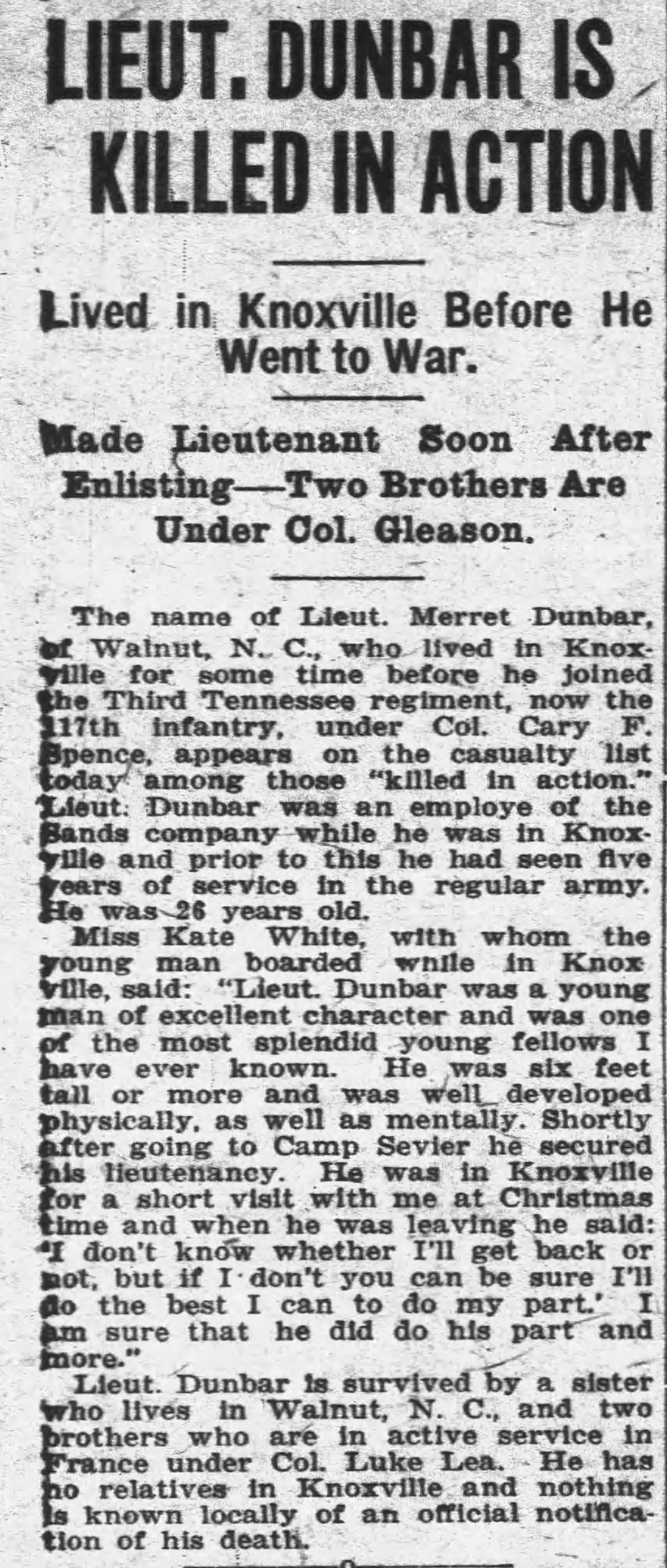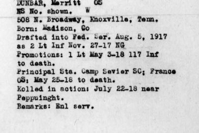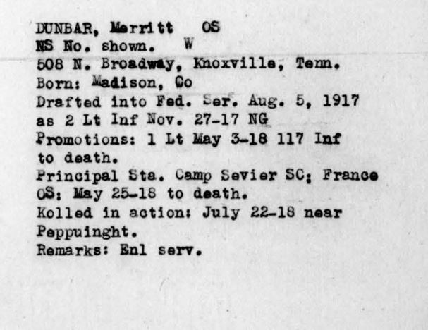 He entered the service of the U.S. Army on July 25, 1917. His organization was Supply Company, 117th Infantry, 30th Division, stationed at Camp Sevier, SC. Sailed for France on May 11, 1918. Lieutenant Dunbar was killed by shell fire near Ypres on July 22, 1918.