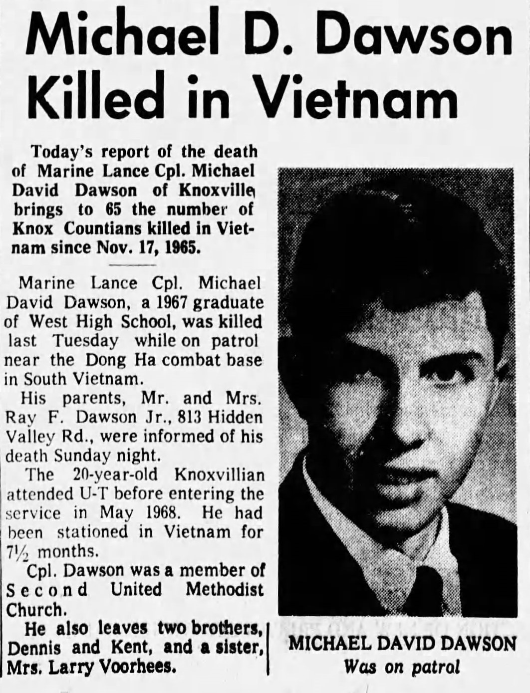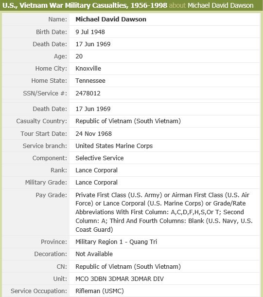 On 17 June 1969, during Operation Virginia Ridge, the 3rd Battalion, 3rd Marines, lost 19 men in a heavy engagement with North Vietnamese Army units; 10 of the dead were from the 3rd Marines/ 3rd Marine Division. Michael Dawson was one of these men.