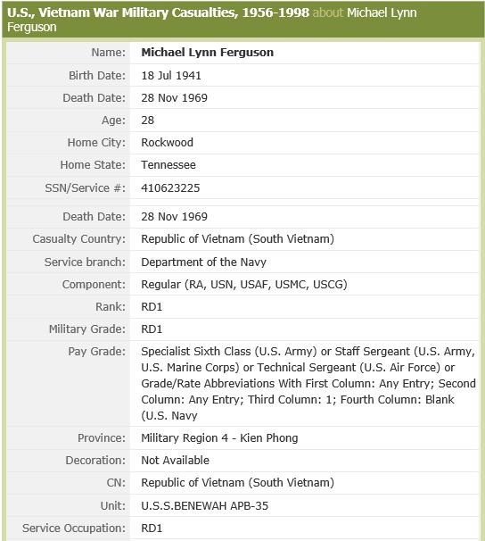 He had enlisted in the United States Navy. Entered the service via Regular Military. Served during the Vietnam War. Ferguson had the rank of Petty Officer First Class. His military occupation or specialty was Radarman First Class. Service number assignment was 410623225.