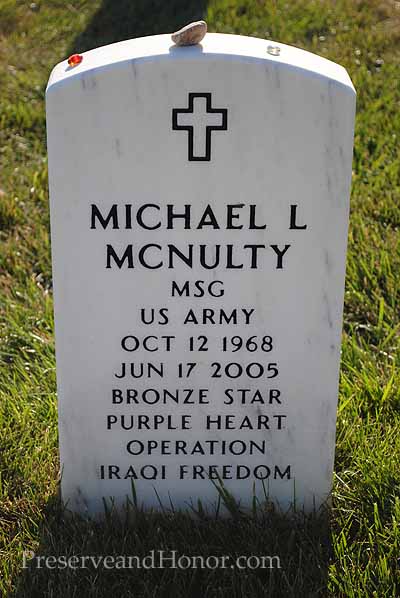 Master Sergeant Michael L. McNulty died on June 17, 2005 at the age of thirty-six in Qaim Iraq. He was born on October 12, 1968 in Knoxville. He was a Green Beret with the US Army Special Operations Command HQ. McNulty is buried at Arlington National Cemetery, Arlington, Virginia. He was awarded the Bronze Star and Purple Heart.
