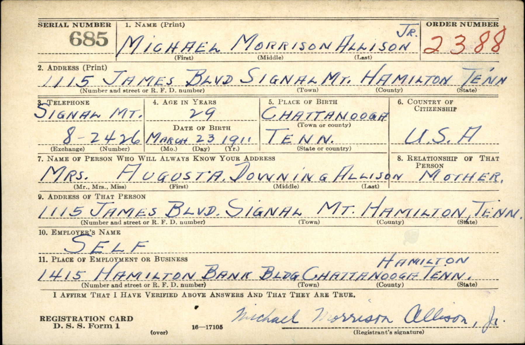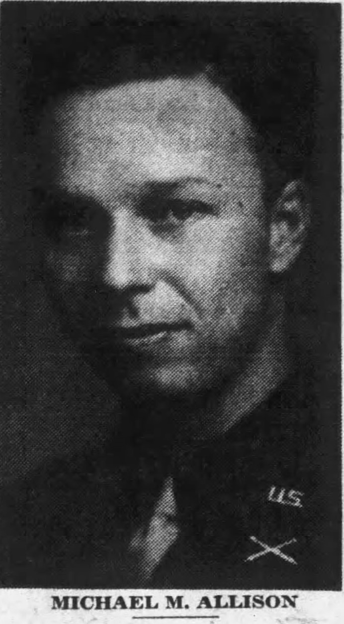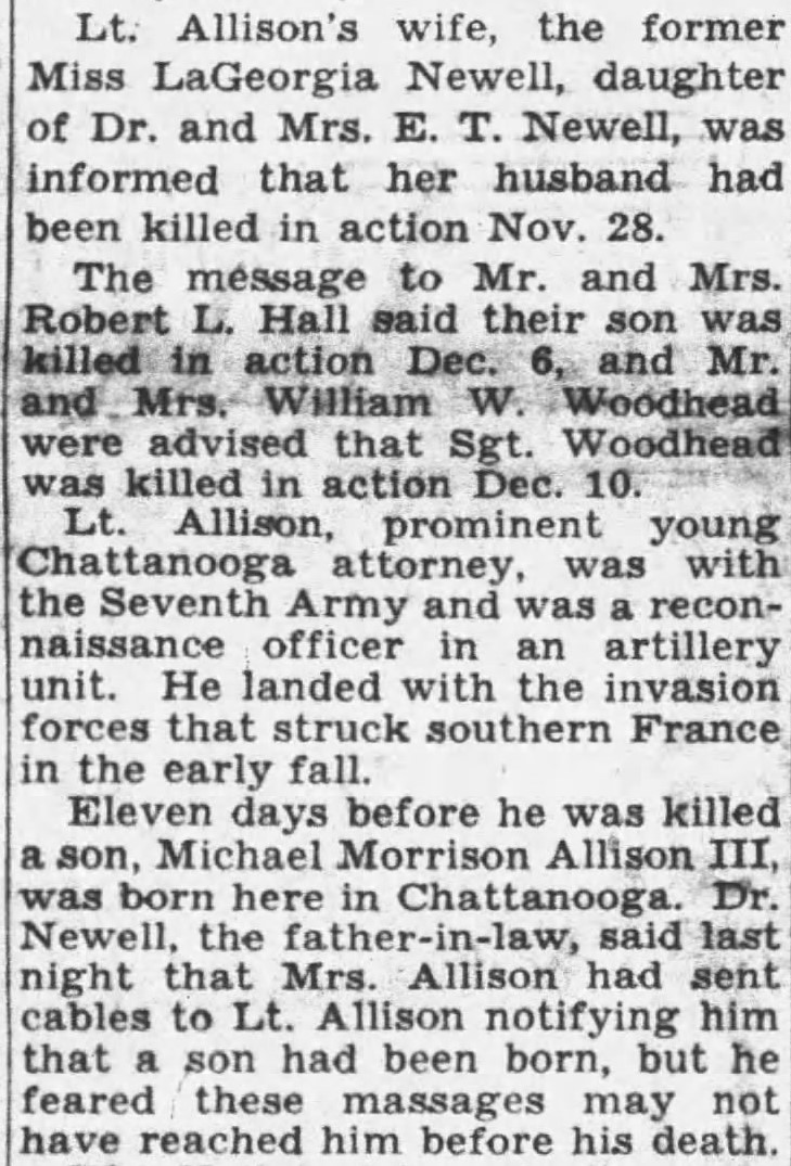 Lt. Michael M. Allison was killed in action in Europe. Lt. Allison’s wife, the former miss LaGeorgia Newell, daughter of Dr. And Mrs. E.. Newell, was informed that her husband had been killed in action Nov. 28. Lt. Allison, prominent young Chattanooga attorney, was with the Seventh Army and was a reconnassance officeer in an artillery unit. He landed with the invasion forces that struck southern France in early fall. Eleven days before he was killed a son, Michael Morrison Allison III, was born here in Chattaooga. Dr. Newell, the father-in-law, said last night that Mrs. Allison notifying him that a son had been born, but he feared these messages may nog have reached him before his death.