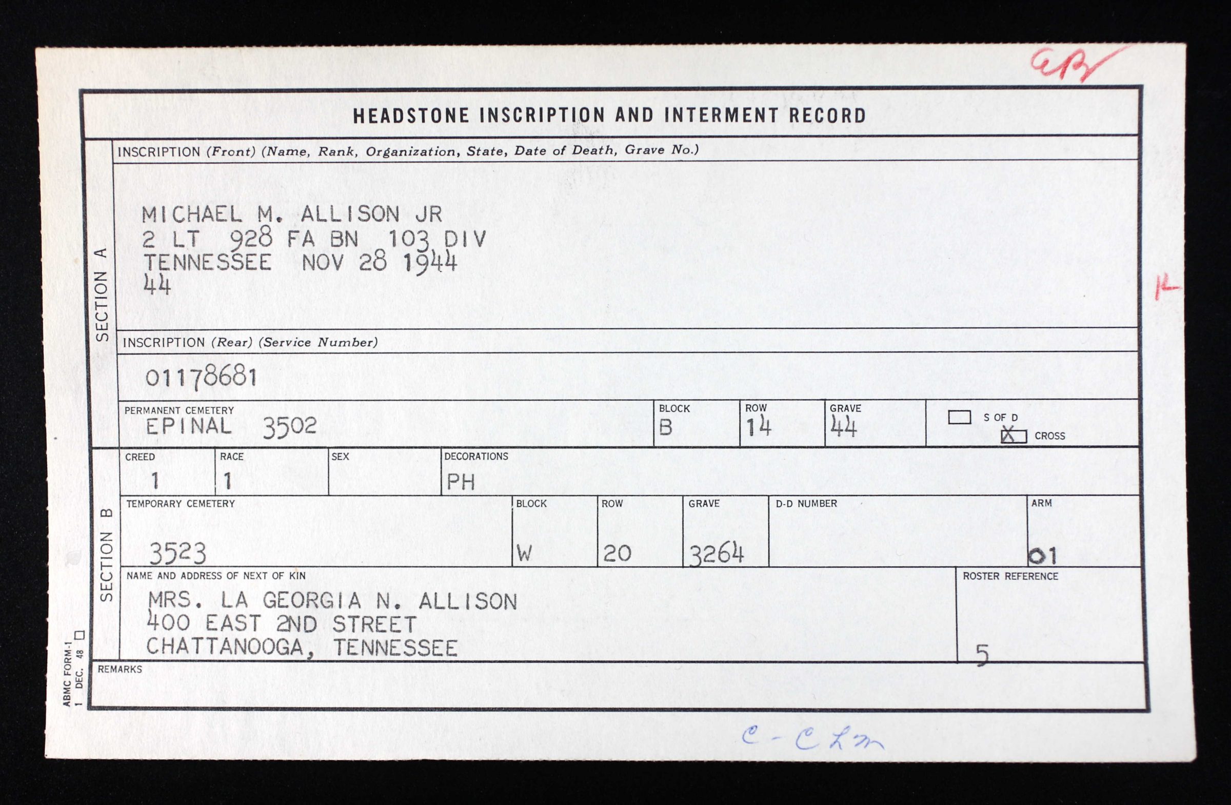 2nd Lieutenant Michael M. Allison was assigned to the 928th Field Artillery Battalion 105mm Howitzers, 103rd Infantry Division. At the time of his death the 103rd Division was fighting in France. He was Killed in Action 28 November 1944 and is interred at B,14,44 Epinal American Cemetery, Epinal, France.
