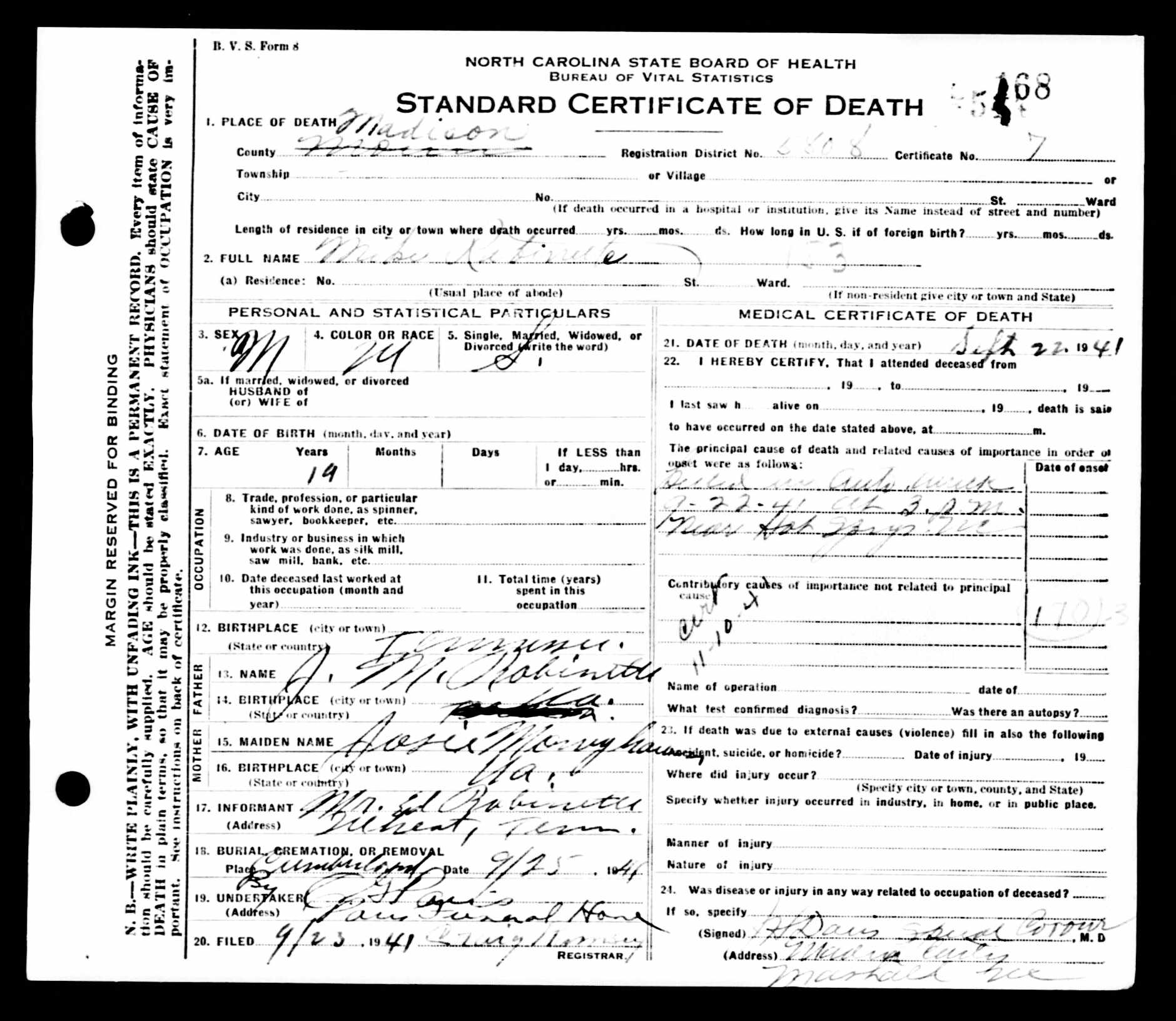 Died non Battle 22 September 1941, McDowell County, North Carolina