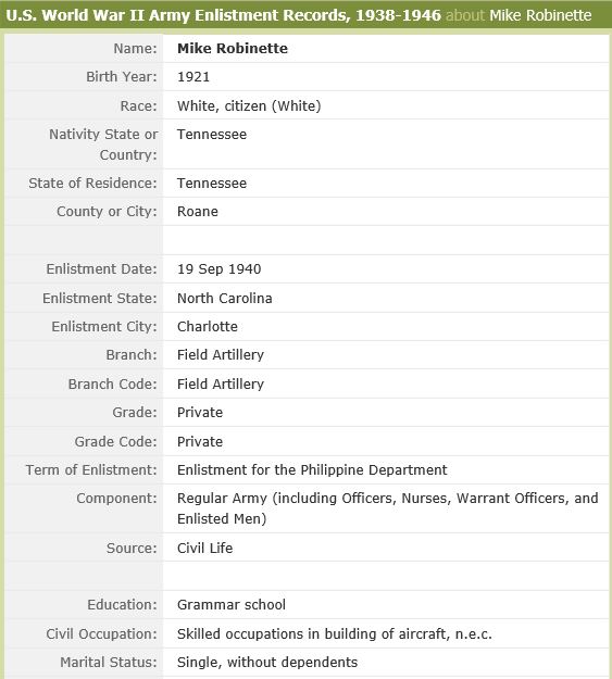 Pvt Robinette enlisted on 19 September 1940 at Charlotte, North Carolina. He is buried at Crawford Memorial Cemetery, AEC #7, Roane County, Tennessee.