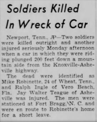 The dead were identified as Mike Robinette, 24 of Wheat, Tenn., and Ralph Ingle of Vero Beach, Fla. Jay Walter Teague of Asheville was injured. The men were stationed at Fort Bragg, N.C. and were en route to Robinette’s home for a short leave.