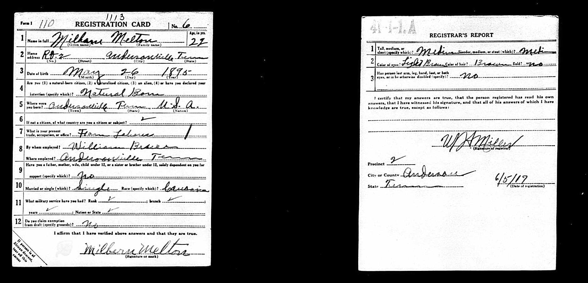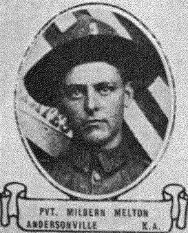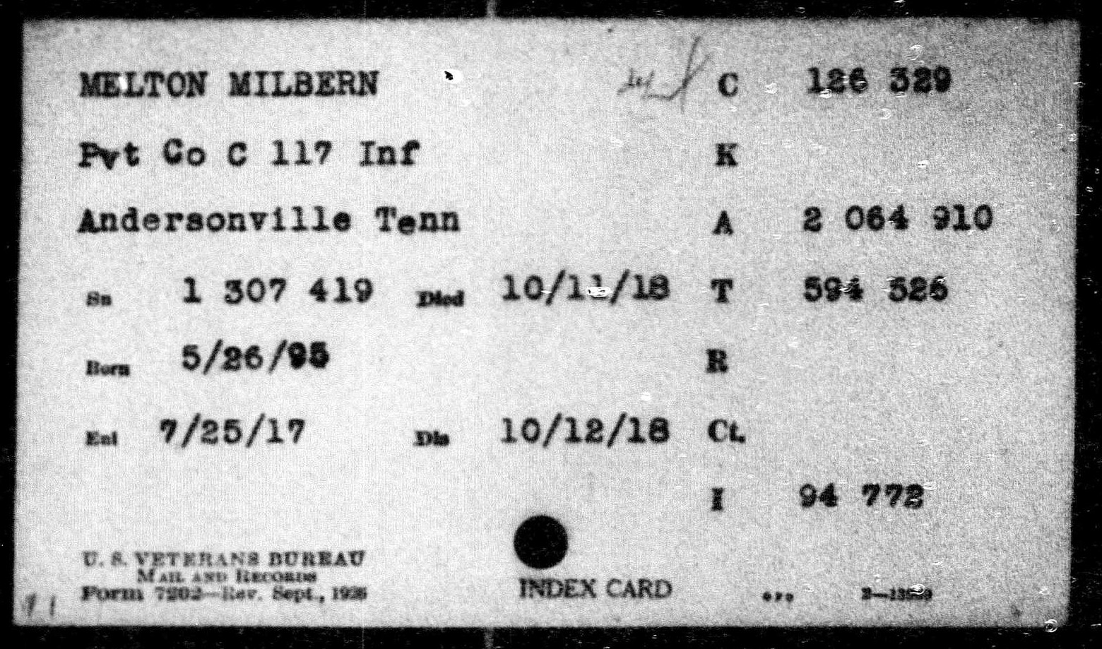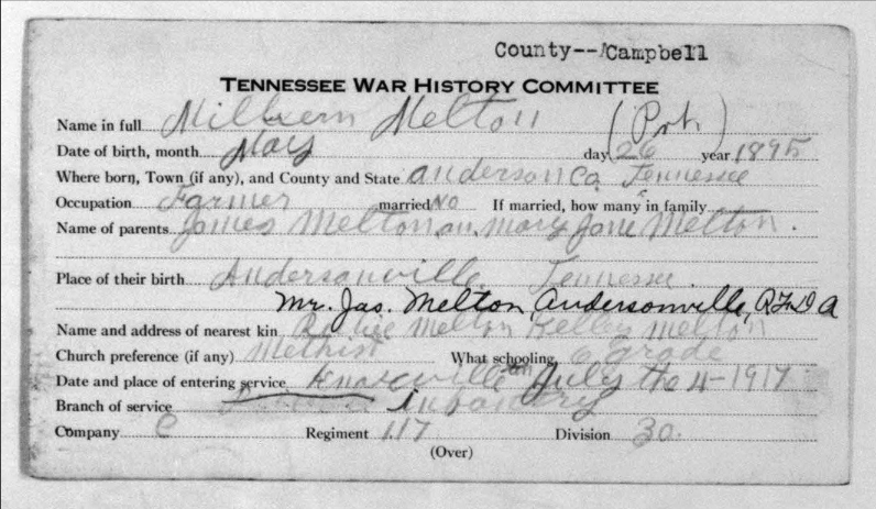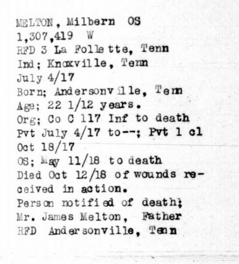 Private First Class Milbern Melton was born on May 26, 1895 in Andersonville, Tennessee. He was the son of James Melton and Mary Jane Hatmaker Melon. He was the brother of Rubie Melton, Delia Melton, Kelly Melton, Joe Zee Melton, Bertha Melton, and Alvin L. Melton. Prior to joining the military, he was employed as a farm laborer. During his service in World War I, he served with Company C, 117th Infantry Regiment, 30th Division. He died of wounds on October 12, 1918. He is buried at Somme American Cemetery in Bony, France (Plot C, Row 6, Grave 9).