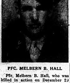 Pfc. Melbern B. Hall, who was killed in action on December 29 in Belgium. Pfc. Hall was the nephew of Rebecca Freeman of Newport. He is also survived by two sisters, Sylvia and Vella Hall, one brother, Collis Hall who is serving in the Philippines, his grandfather, Sam D. Hall of Del Ria. He was the son of the late Mr. and Mrs. Jake Hall of Hartford.