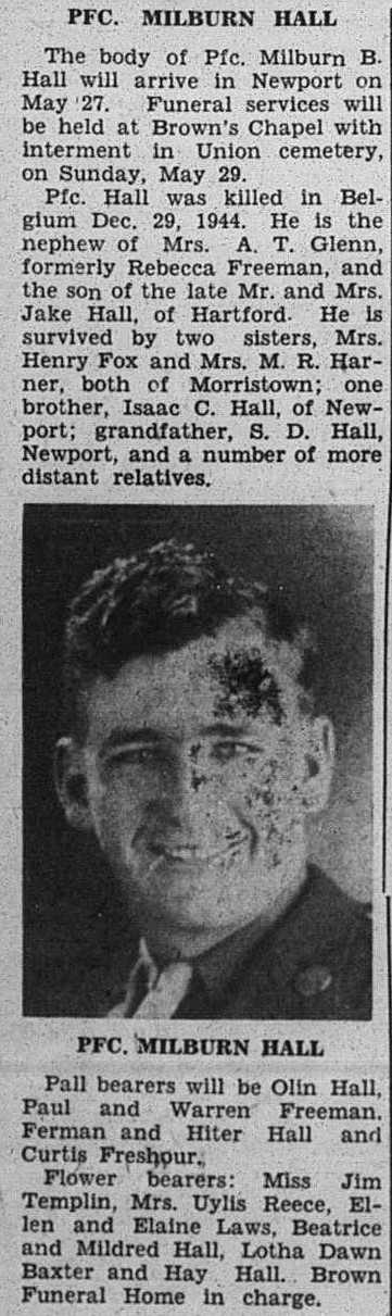 Pfc. Hall was killed in action in Belgium, Dec. 29, 1944. He is the nephew of Mrs. A.T. Glenn, formerly Rebecca Freeman, and the son of the late Mr. and Mrs. Jake Hall of Hartford. He is survived by two sister, Mrs. Henry Fox and Mrs. M.R. Harner, both of Morristown; one brother, Isaac C. Hall, of Newport; grandfather, S.D. Hall, Newport and a number of more distant relatives.