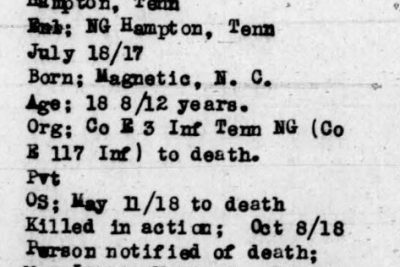 After his parents decided that Milburn should come home, he was disinterred and sent to Calais, France were he sailed home aboard the United States Army Transport “Somme” on 27 February 1921. Milburn arrived Hoboken, New Jersey on 14 March for his last leg home. His parents first requested he be returned to Buladean for reinterment, but reconsidered and Milburn was interred at the Mountain Home National Cemetery, Mountain Home, Tennessee in Section A, Row 14, Site 2 on 19 April. 1921.