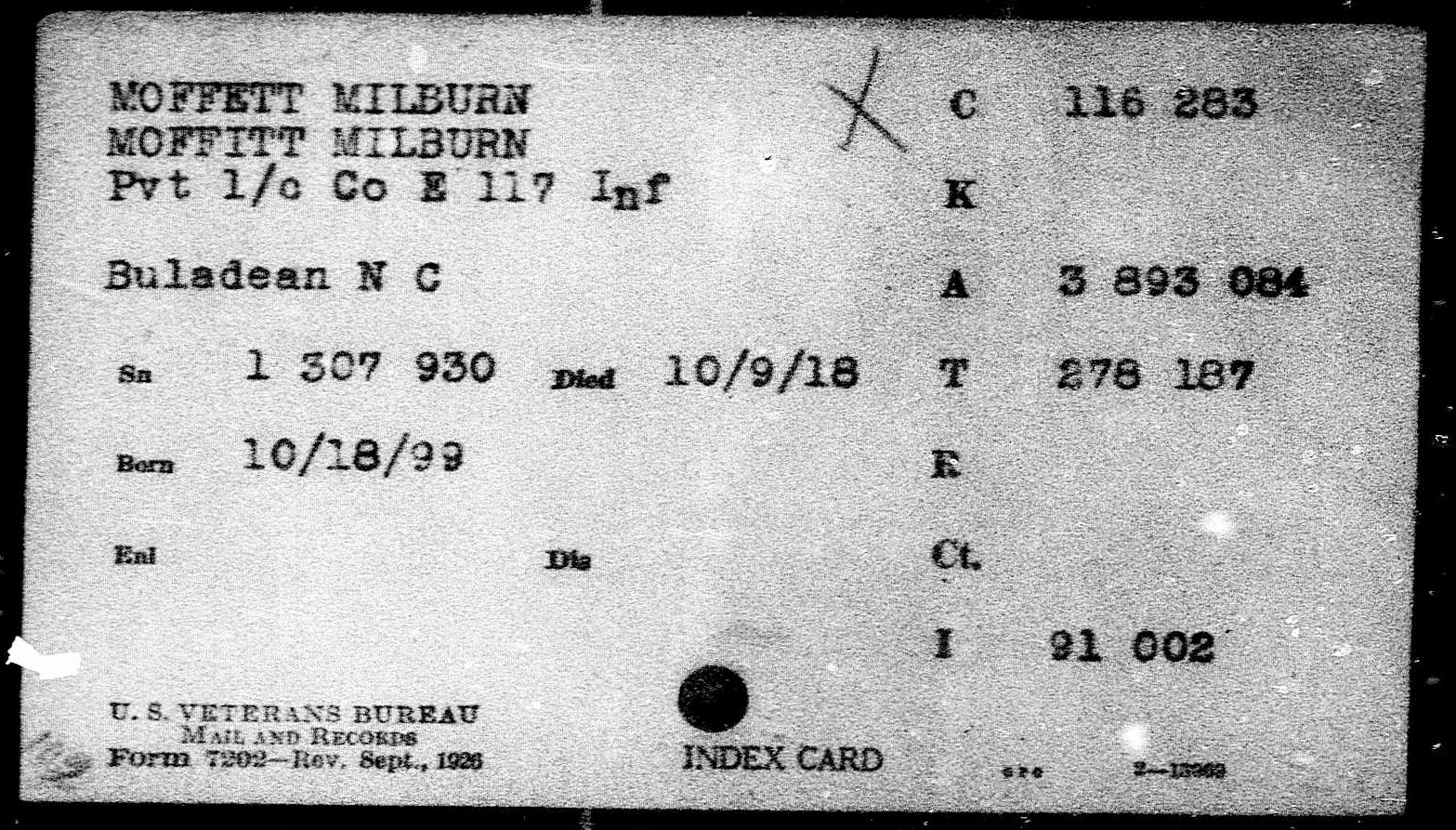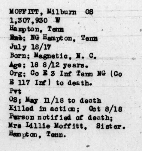 Milburn’s brother Robert Hobart Moffitt was my great grandfather. It was passed down that Robert watched Milburn die from an explosion of some sort. Robert was also wounded with mustard gas but survived. Attached is a copy of Milburn’s military death certificate.