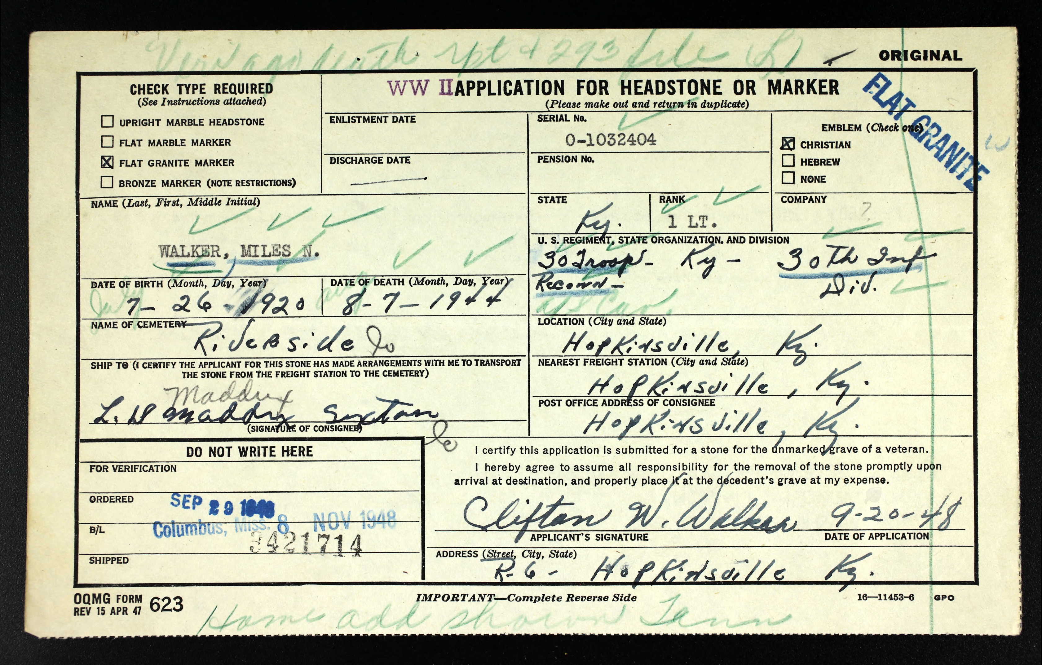 Miles Noel Walker was born in Kentucky on 26 July 1920 to Clifton Walter Walker and Ida May Vanhooser. His brother, Walter E. Walker was killed in action in 1945. Miles was the husband of Mrs. Frances Walker, 3115 12th Avenue, Chattanooga.