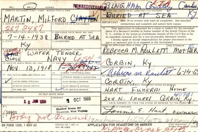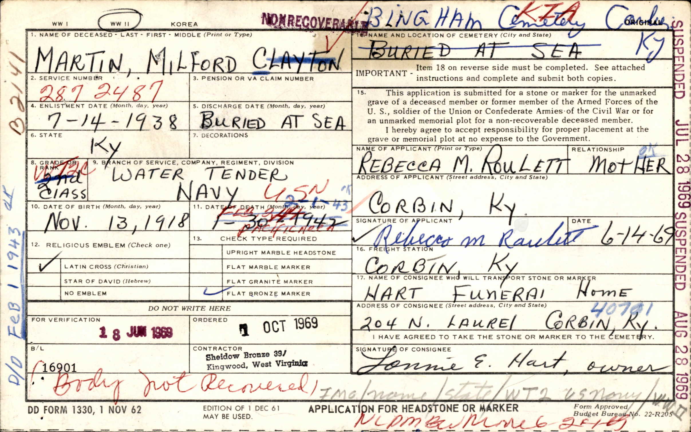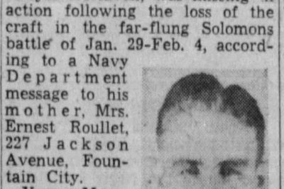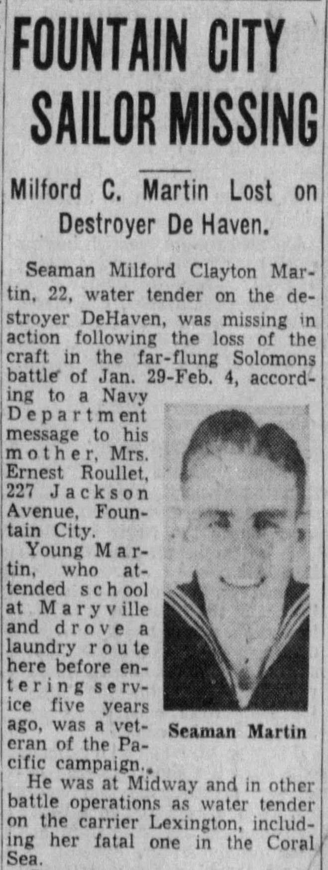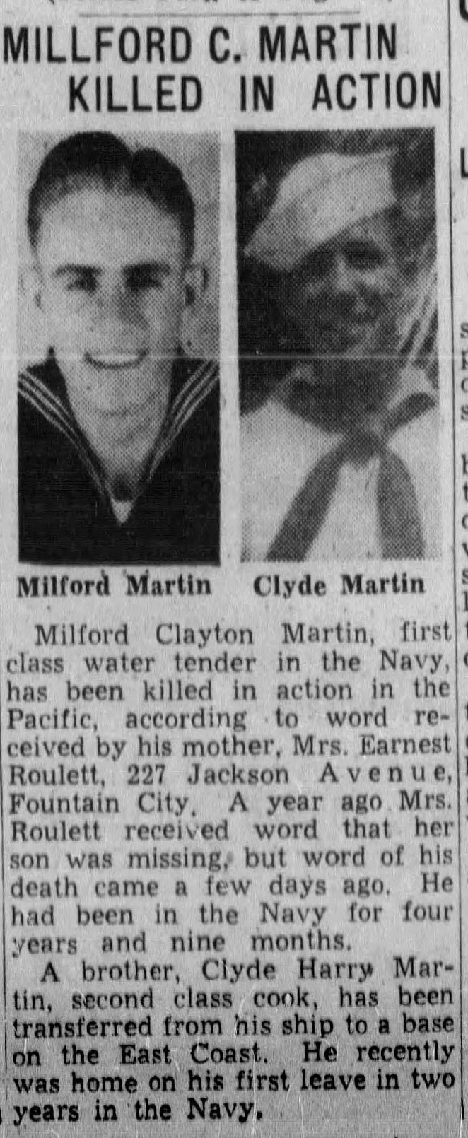 Mildord Clayton Martin, first class water tender in the Navy, has been killed in action in the Pacific, according to word received by his mother, Mrs. Earnest Roulett, 227 Jackson Avenue, Fountain City. A year ago, Mrs. Roulett received word that her son was missing, but word of his death came a few days ago. He had been in the Navy for four years and nine months. A brother, Clyde Harry Martin, second class cook, has been transferred from his ship to a base on the East Coast. He recently was home on his first leave in two years in the Navy.