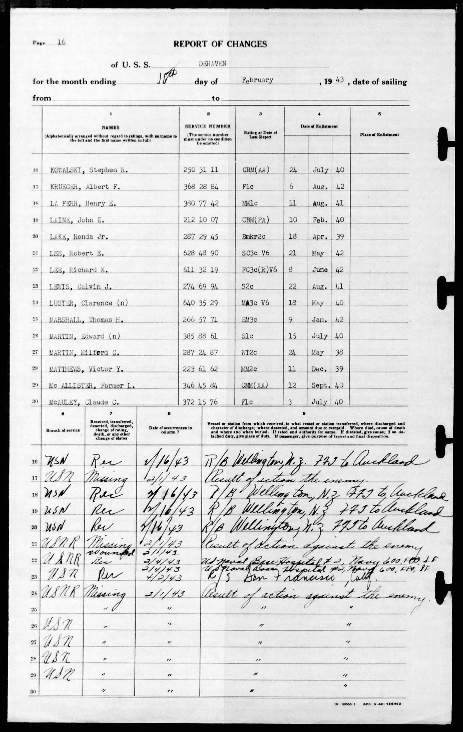 He served on the U.S.S. Dehaven. The Dehaven was sunk by Japanese dive bombers off the Solomons in February 1, 1943.