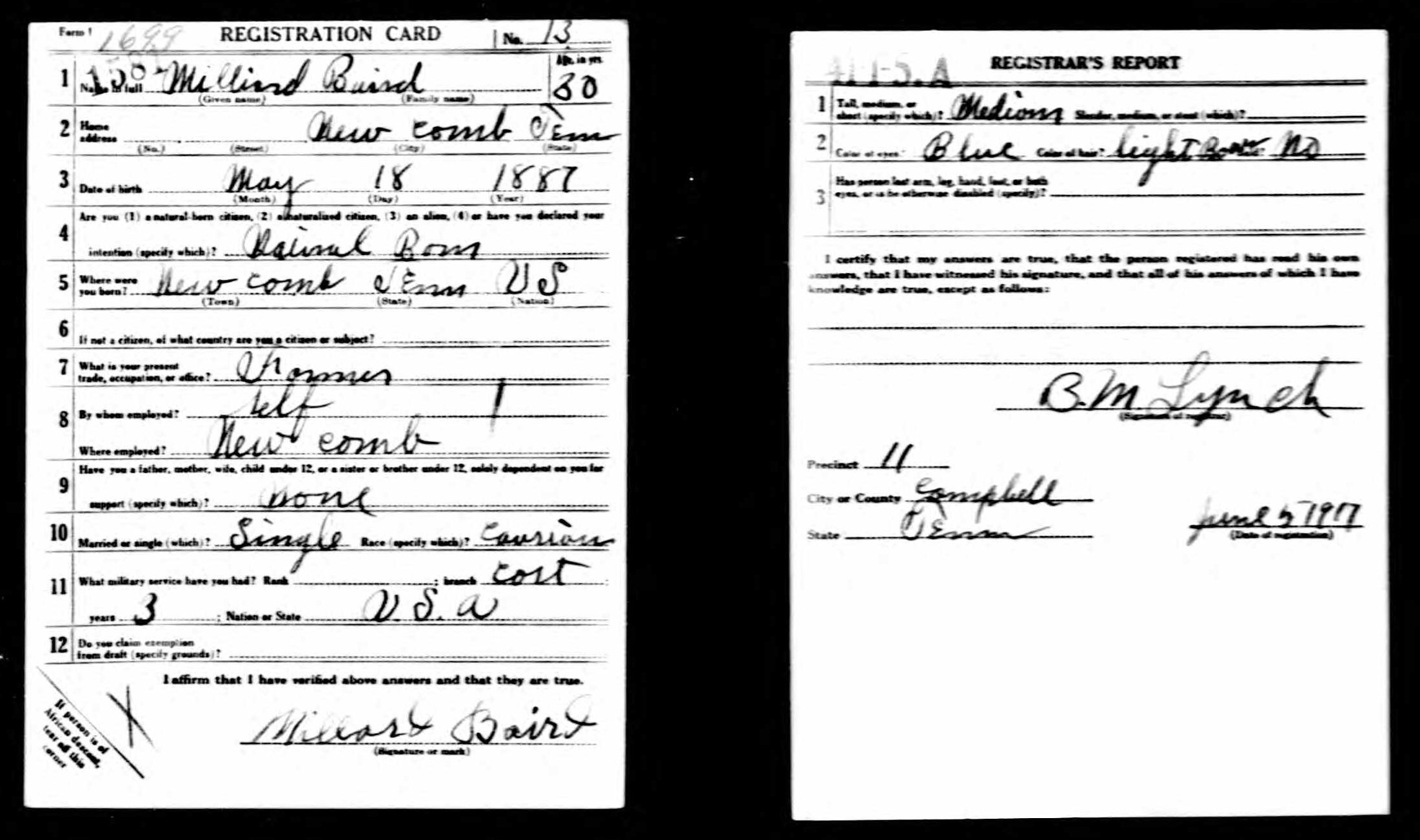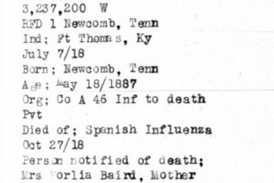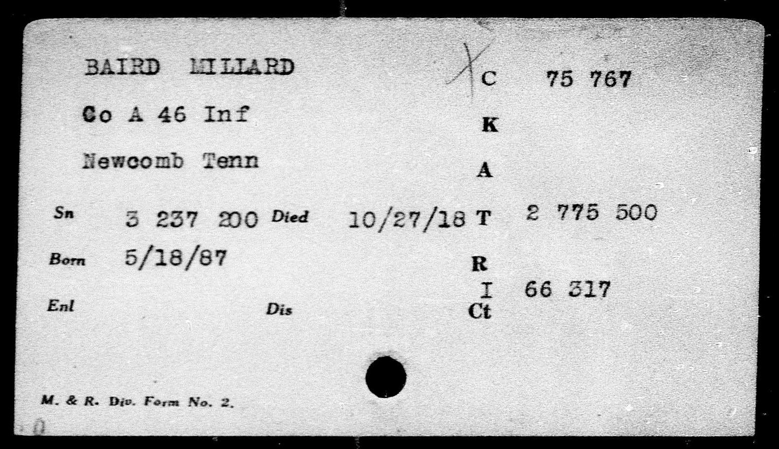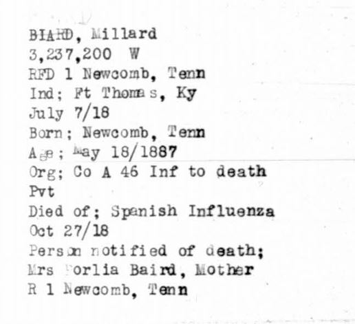 Millard Baird was born in 1887 at Newcomb, TN. He was inducted at Fort Thomas in Kentucky on 7 July 1918. He died of the Spanish influenza on 27 October.