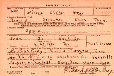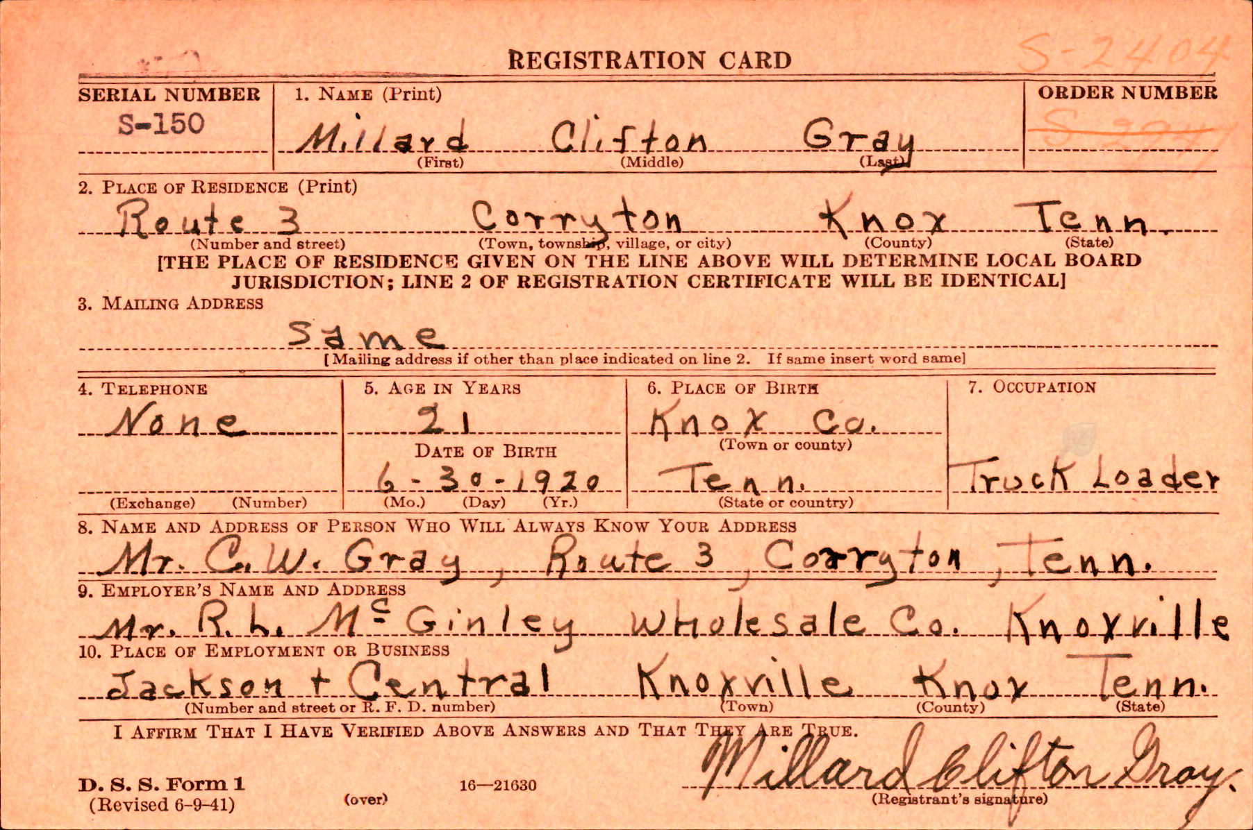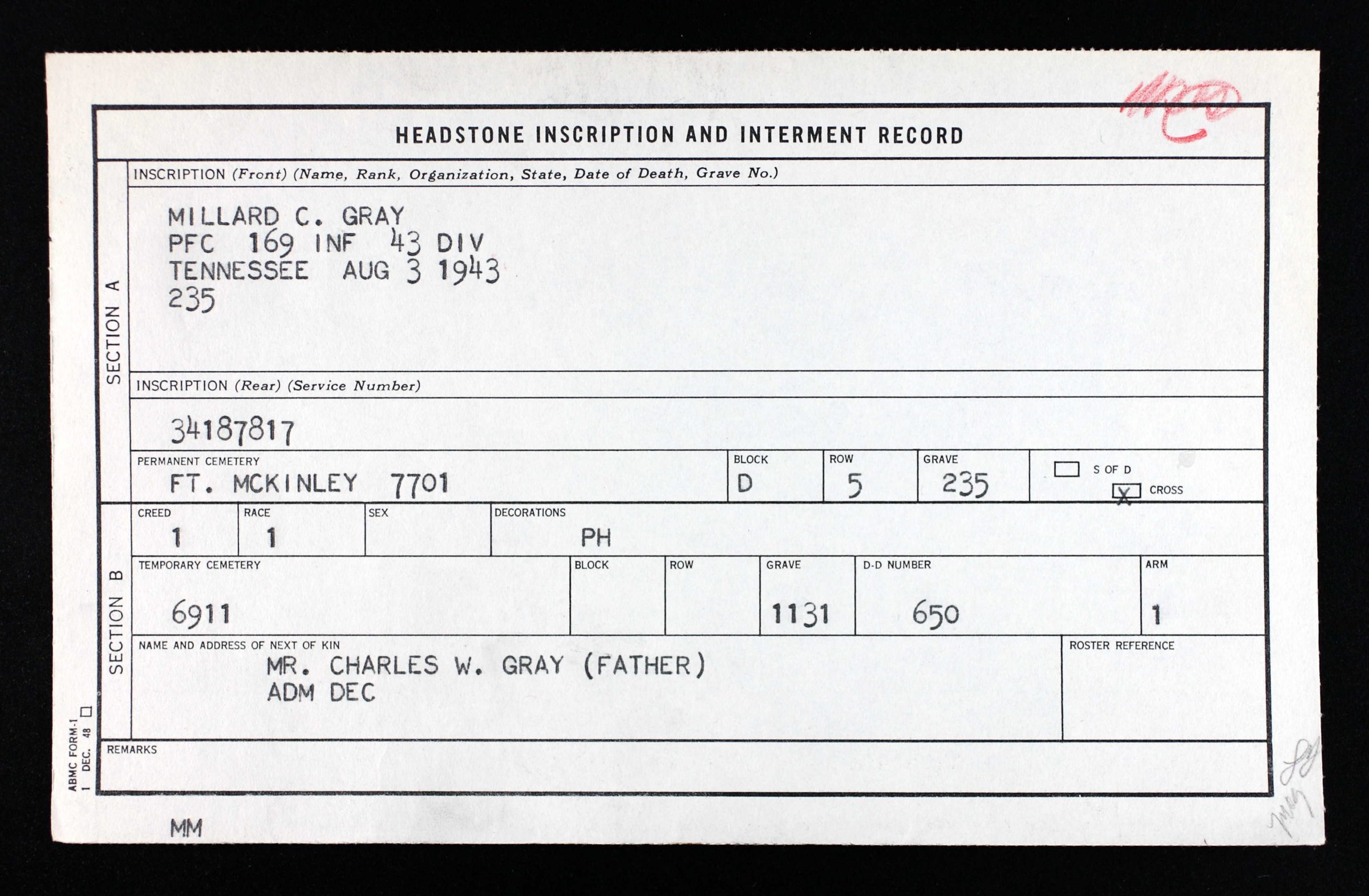 Millard Clifton Gray was born 30 on June 1920. He was the son of Charles Webster Gray and Martha Wright. Brother of Joseph Gray, Trula Gray, Marie Gray, Walter Gray, Otis Gray, Louise Gray, Mary Gray, Charles Gray, Dartha Gray, and Ineogine Gray. Millard enlisted on February 8, 1942 in Fort Oglethorpe, GA.
