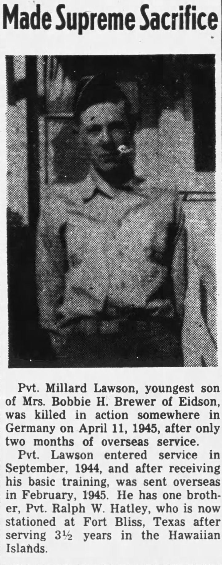 Pvt. Miljard Lawson, youngest son of Mrs. Bobbie H. Brewer of Eidson, was killed in action somewhere in Germany on April 11, 1945, after only two months of overseas service. Pvt. Lawson entered service in September, 1944, and after receiving his basic training, was sent overseas in February, 1945. He has one brother, Pvt. Ralph W. Hatley, who is now stationed at Fort Bliss, Texas after serving 3 ½ years in the Hawaiian Islands.
