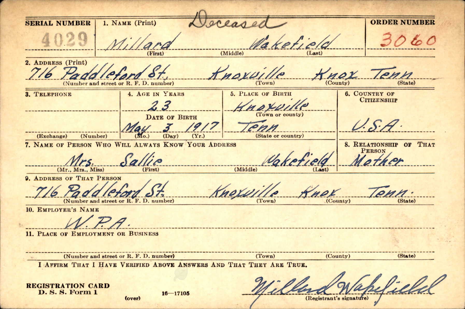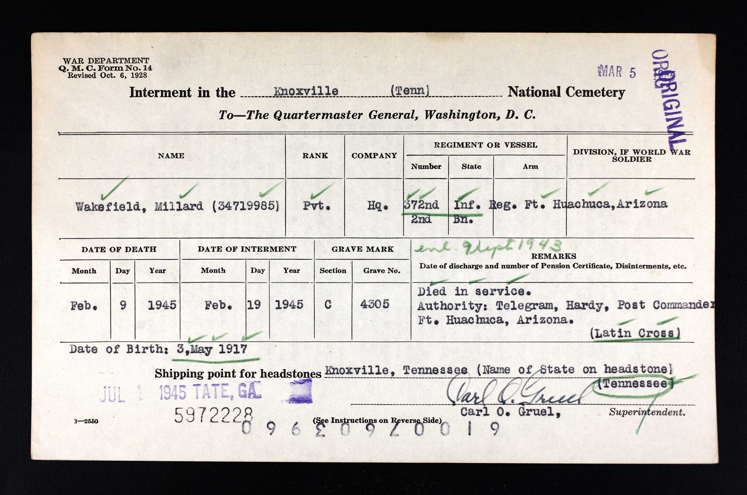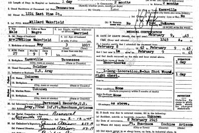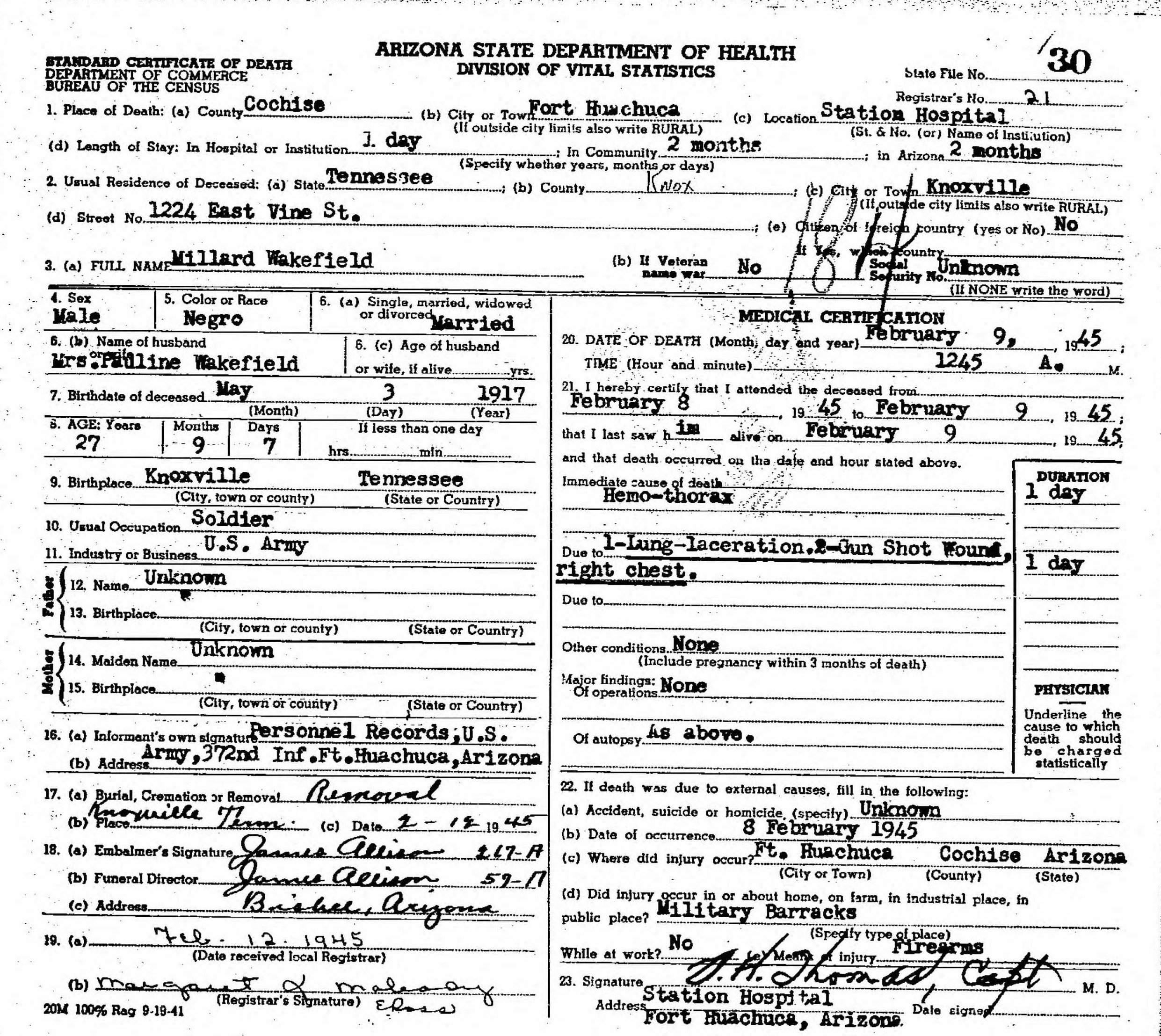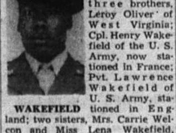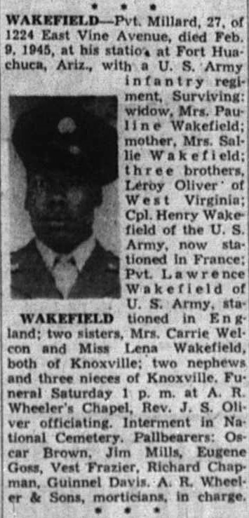 Pvt. Miljard Wakefield, 27, of 1224 East Vine Avenue, died Feb. 9, 1945, at his staiton at Fort Huachuca, Ariz., with a U.S. Army Infantry Regiment. Surviving; widow, Mrs. Pauline Wakefield; mothers, Mrs. Sallie Wakefield; three brothers, Leroy Oliver of West Virginia; Cpl. Henry Wakefield of the U.S. Army, now stationed in France; Pvt. Lawrence Wakefield of U.S. Army, stationed in England; two sisters, Mrs. Carrie Welcon and Miss Lena Wakefield, both of Knoxville; two nephes and three nieces of Knoxville.