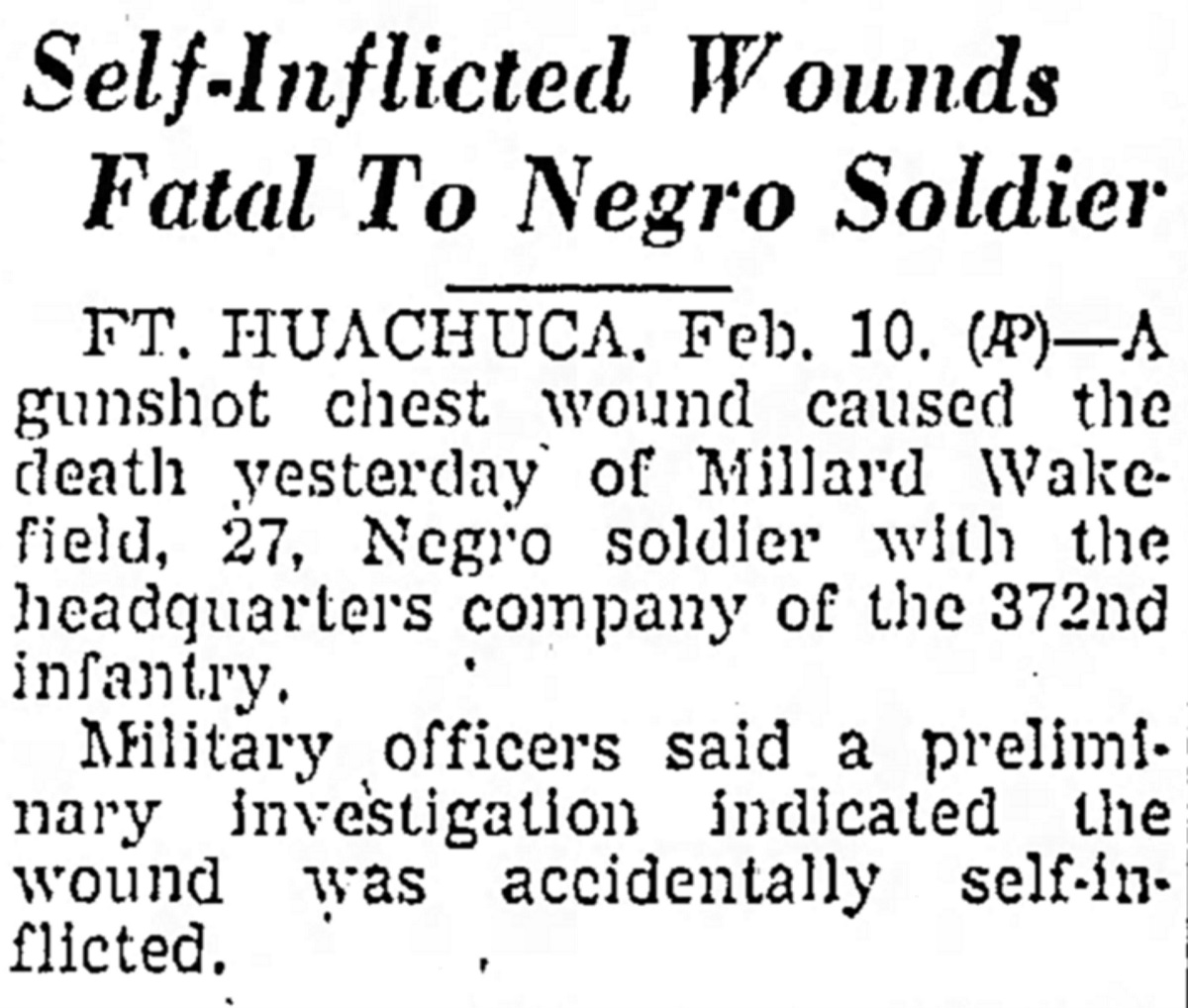 T. Huachuca, Feb. 10 – A gunshot chest wound caused the death yesterday of Miljard Wakefield, 27, Negro soldier with the headquarters company of the 372nd infantry.