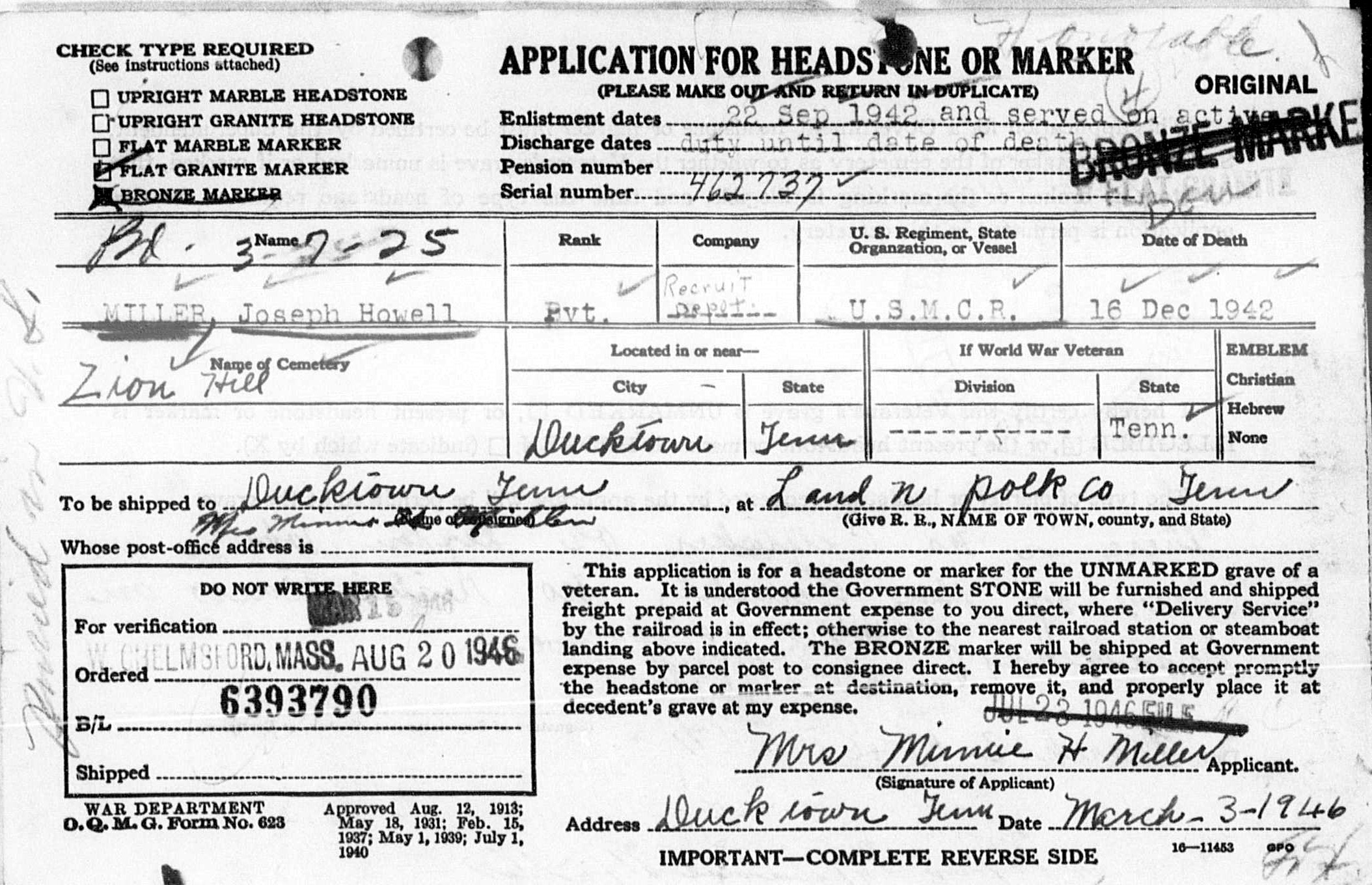 Ducktown, Dec. 17 – Joseph Howell Miller, 17, who enlisted in the U.S. Marines three months ago, was killed at San Diego, Calif., while guarding a naval radio station, the War Department announced. He is the son of Mrs. Will Miller and the late Mr. Miller of Ducktown. No particulars of the death were given. Other survivors are two brothers, William R. and Hugh.D. Miller, both of Ducktown, and one sister, Mrs. William (Katherine) Sweeny, Lenoir City. The body will be brought to Ducktown Monday or Tuesday.