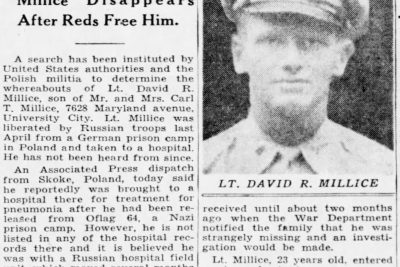 A search has been instituted by United States authorities and the Polish militia to determine the whereabouts of Lt. David R. Millice, son of Mr. and Mrs. Carl T. Millice, 7628 Maryland Avenue, University City. Lt. Millice was liberated by Russian troops last April from a German prison camp in Poland and taken to a hospital. He has not been heard from since. An Associated Press dispatch from Skoke, Poland today said he reportedly was brought to a hospital there for treatment for pneumonia after he had been released from Oflag 64, a Nazi prison camp. However, he is not listed in any of the hospital records there, and it is believed he was with a Russian hospital fields unit that moved several months ago. Col. Walter Pashley, United States military attaché in Poland, is conducting the investigation with the co-operation of the chief of the Polish militia. Carl Millice, who is purchasing agent for the American Zinc, Lead and Smelting Co., said the family had been notified by the War Department last April that his son had been liberated and taken to the hospital at Skoke. No further word concerning him was received until about two months ago when the War Department notified the family that he was strangely missing and an investigation would be made. Lt. Millice, 23 years old, entered service about two years ago while in his senior year at the University of Tennessee at Knoxville. He was sent overseas in the fall of 1944. He was attached to an infantry division and was taken prisoner during the Battle of the Bulge in December 1944 in Belgium. The family heard regularly from him while he was a prisoner of war, the father said, but has had no word from him since his liberation.