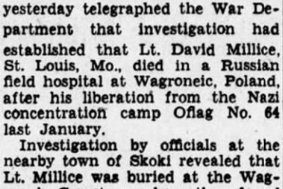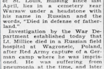 Warsaw, Dec. 19 – American Air Attache Lt. Col. Edward J. York yesterday telegraphed the War Department that an investigation had established that Lt. David Millice, St. Louis, Mo., died in a Russian field hospital at Wagroneic, Poland, after his liberation from the Nazi concentration camp Oflag No. 64 last January. Investigation by officials at the nearby town of Skoki revealed that Lt. Millice was buried at the Wagroneic Cemetery, where they found a headstone bearing his name in Russian – “David Millice, American lieutenant, flyer, died in defense of fatherland.” Lt. Millice was an artilleryman, and it is believe the Russians confused the branches of service.