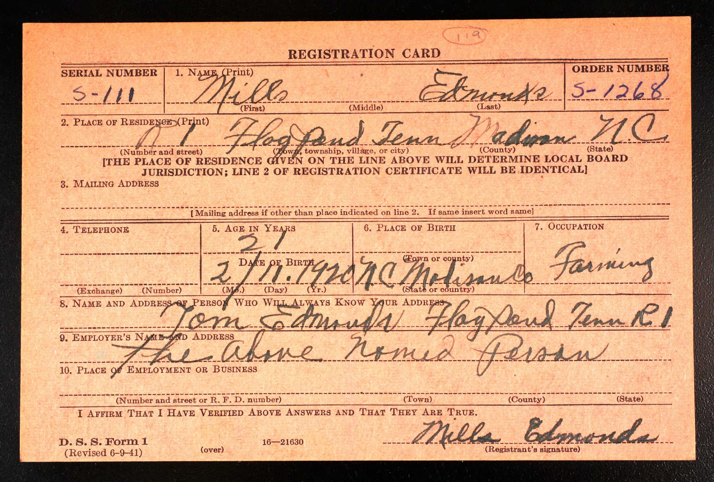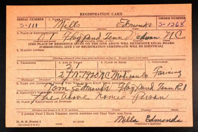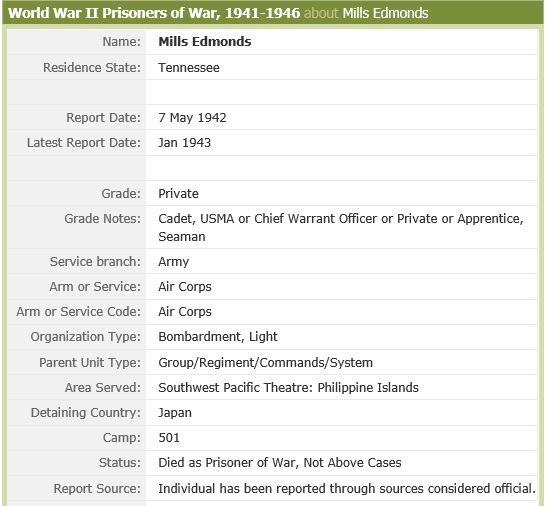 “Mills was the son of Thomas Sheridan Edmonds and Pansy Mae Hall of Madison County, North Carolina. His older brother, Spurgeon Edmonds, was my grandfather and he often told me about Mills being killed in the Bataan Death March. His living nieces are Jean Thomas, West Columbia, SC, Judy Ball, Weaverville, NC, Edna Freud, Marion, NC, Iva Buchanan, Roanoke, VA, Olamae Boshears, Alexandria, VA, and a nephew, Larry Edmonds, Roanoke, VA.”