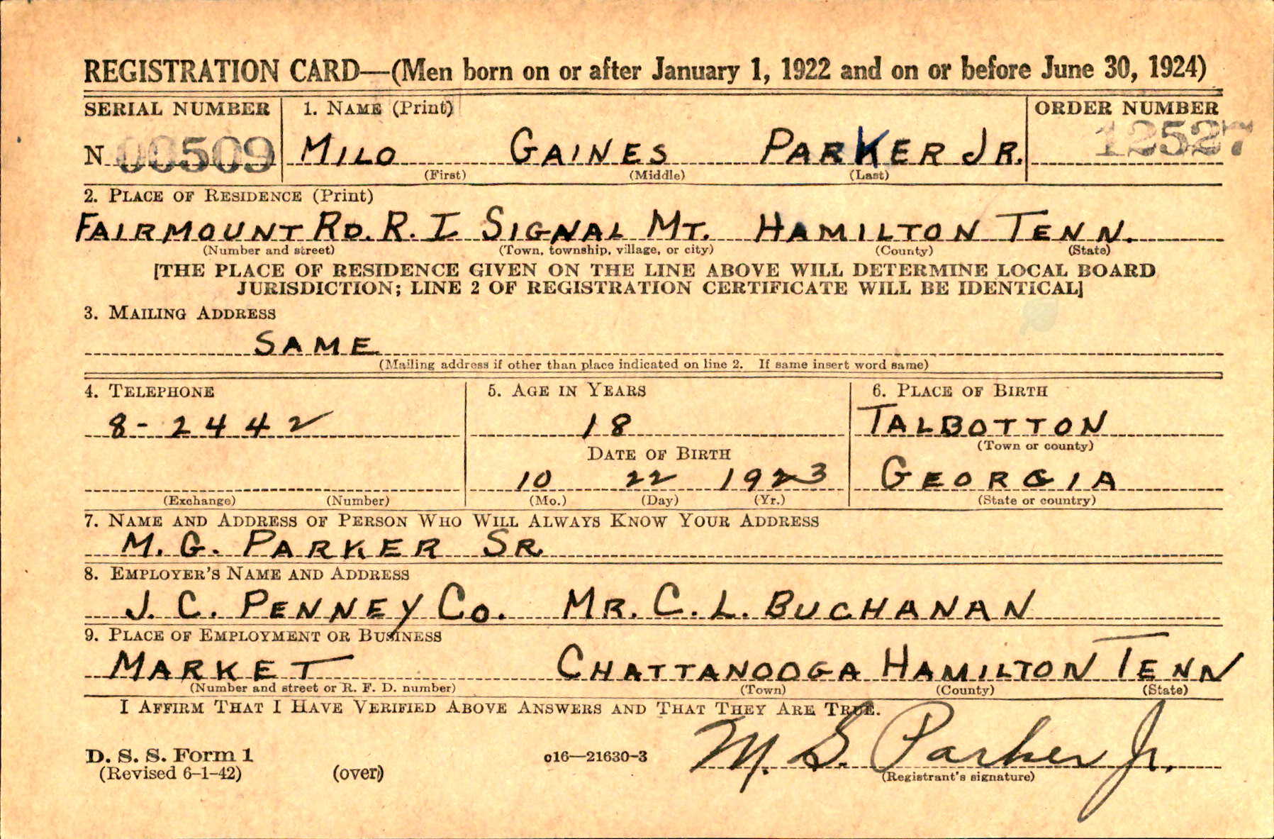 Milo Gaines Parker Jr. was born at Talbotton, Georgia, the son of Milo Gaines Parker Sr. and Virginia Lunsden.