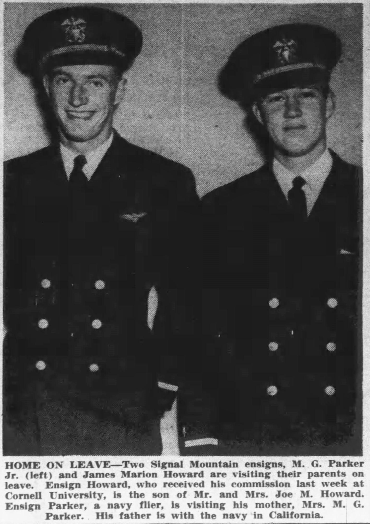 While on leave in Chattanooga last December, Ensign Parker was pictured by The Times when he visited a schoolmate, Ensign James M. Howard, navy flier and son of Mr. and Mrs. Joe Howard, Signal Mountain, Ensign Howard received his commission upon graduation from Cornell University last December, and both spent the Christmas holidays at home. The Navy Department did not disclose Ensign Parker’s station or the theater in which his death occurred, it was stated.