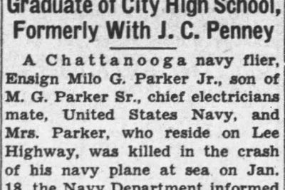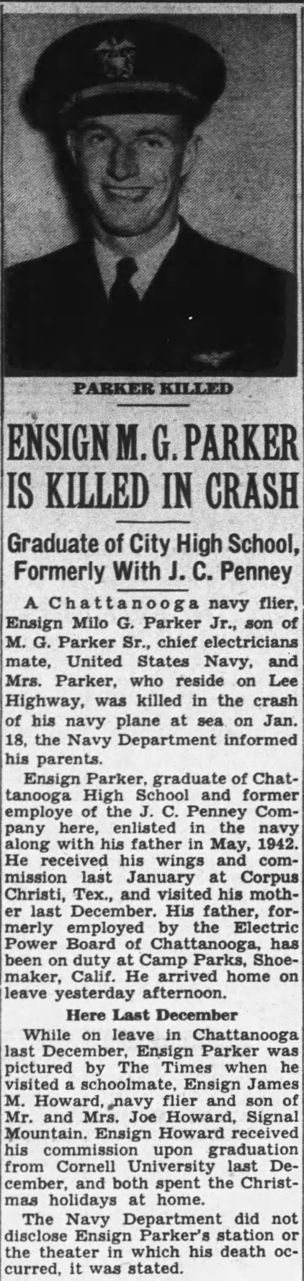A Chattanooga navy flier, Ensign Milo G. Parker Jr., son of M.G. Parker Sr., chief electricians mate, United States Navy, and Mrs. Parker, who reside on Lee Highway, was killed in the crash of his navy plane at sea on Jan. 18, the Navy Department informed his parents. Ensign Parker, graduate of Chattanooga High School and former employe of the J.C. Penney Company here, enlisted in the navy along with his father in May, 1942. He received his wings and commission last January at Corpus Christi, Tex., and visited his mother last December. His father, formerly employed by the Electric Power Board of Chattanooga, has been on duty at Camp Parks, Shoemaker, Calif. He arrived home on leave yesterday afternoon.