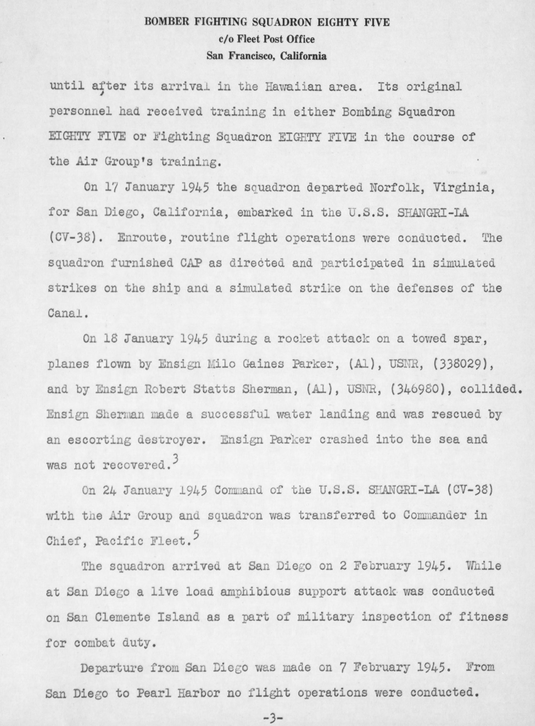 Ensign Parker died January 18, 1945 on a F4U-1D stationed aboard VBF-85 USS Shangri-La CV-38 en route to Panama. On 18 January 1945 during a rocket attack on a towed spar, planes flown by Ensign Milo Gaines Parker, (Al), USNR, (338029), and by Ensign Robert Statts Sherman, (Al), USNR, (346980), collided. Ensign Sherman made a successful water landing and was rescued by an escorting destroyer. Ensign Parker crashed into the sea and was not recovered.
