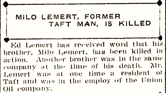 I am the historian from the Kern Veterans Memorial Foundation in Bakersfield, California (Kern County). The Kern Vets created a memorial in 2007 and added a ‘Wall of Valor’ in 2011. Milo Lemert is on our Wall of Valor in Kern County for being a resident in Taft, California working for the Union Oil Company. He is engraved on our Wall of Valor as having a hometown as Taft, California. I also teach an archiving class at Bakersfield High School where my students have done continuous research into the names of those killed in action. This morning as one of my archiving students was attempting to add one of our articles to find-a-grave when she was not sure if the Milo Lemert she was looking at was the Milo Lemert we had the article for. On my end, I discovered that both Milo and his brother and father lived in Taft, California. If your organization can give me any additional information about the families time in California I would greatly appreciate it. If any of his family is still around I would like to put into contact with them as well. Our organization is moving forward on adding a third phase to our memorial called the ‘Medal of Honor’ phase. It will include a special granite stone to the now three servicemen to have received the Medal of Honor. (the other two men were from the Vietnam War.) BTW: Your website is excellent. Thank you, Ken Hooper ken_hooper@kernhigh.org