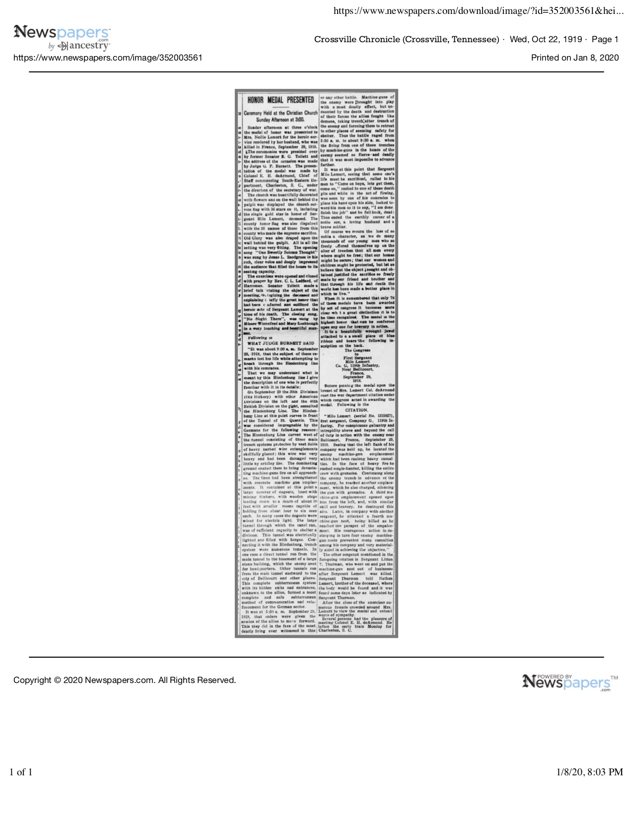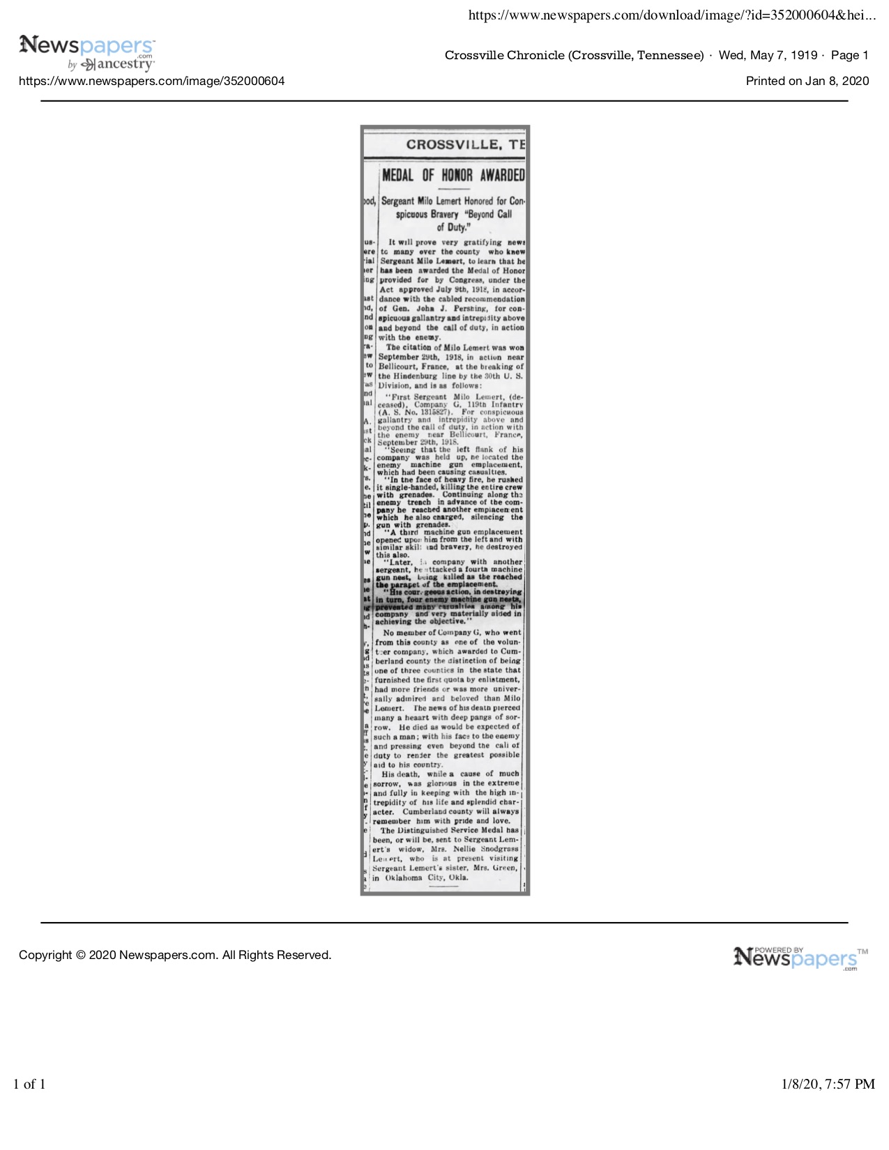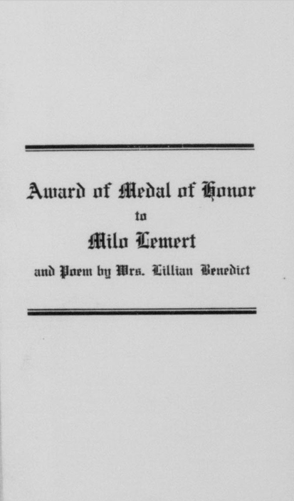 Lemert died heroically on September 29, 1918. Lemert was remembered when the Medal of Honor was presented to his wife of one year at the court house in October 1919. The funeral was held several days later and Milo Lemert was forgotten. For his valor that day, while fighting alongside Lemert, Litton Thurman received the nation’s second highest medal, The Distinguished Service Cross.