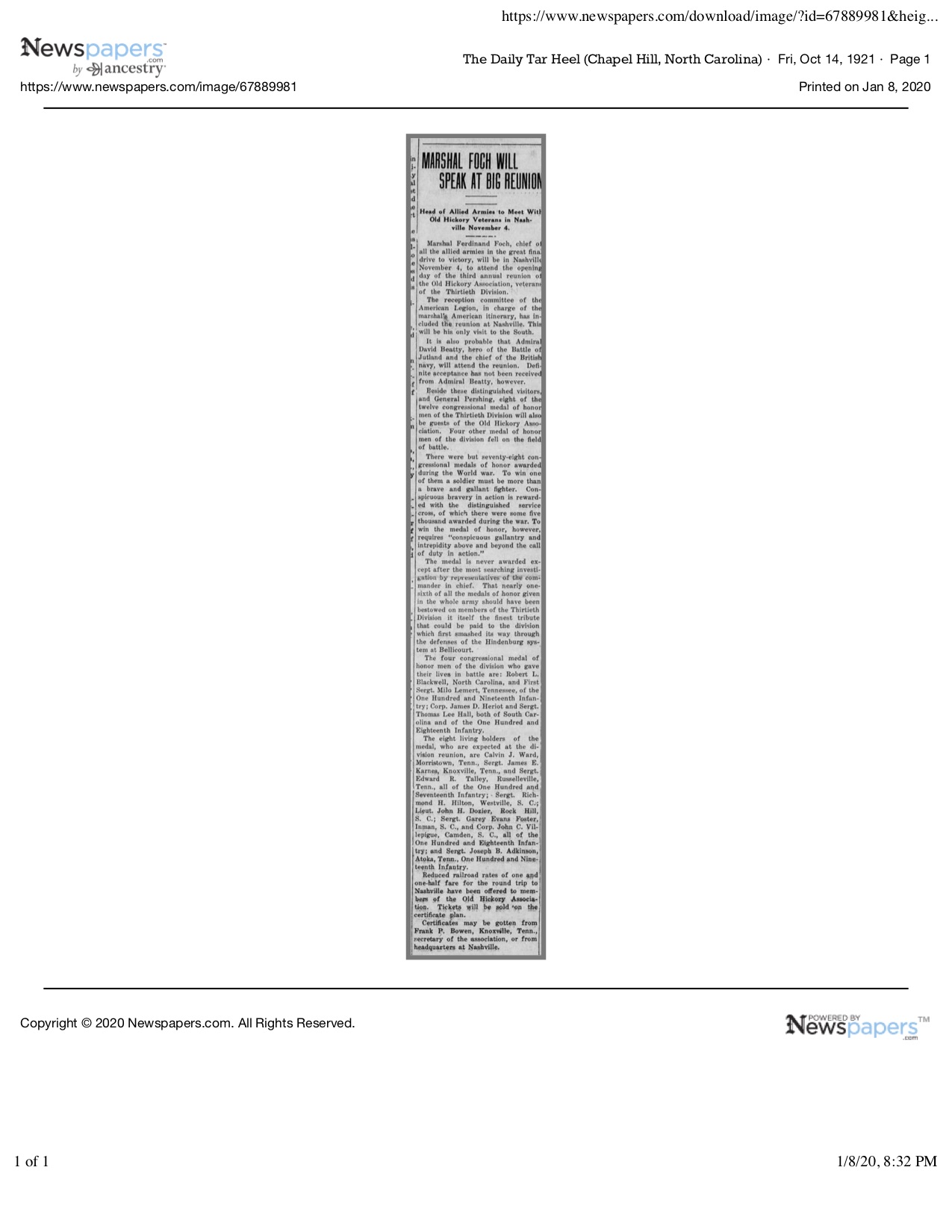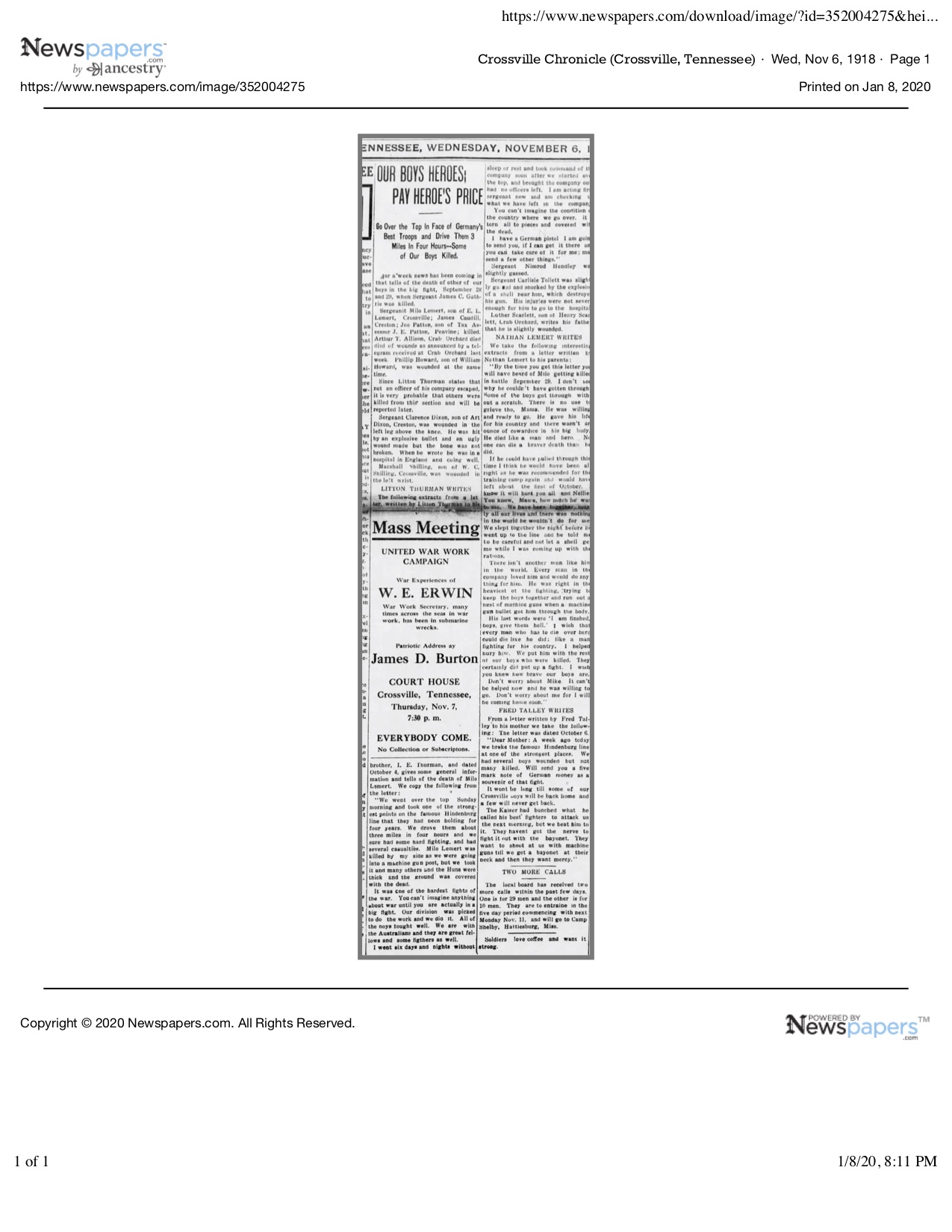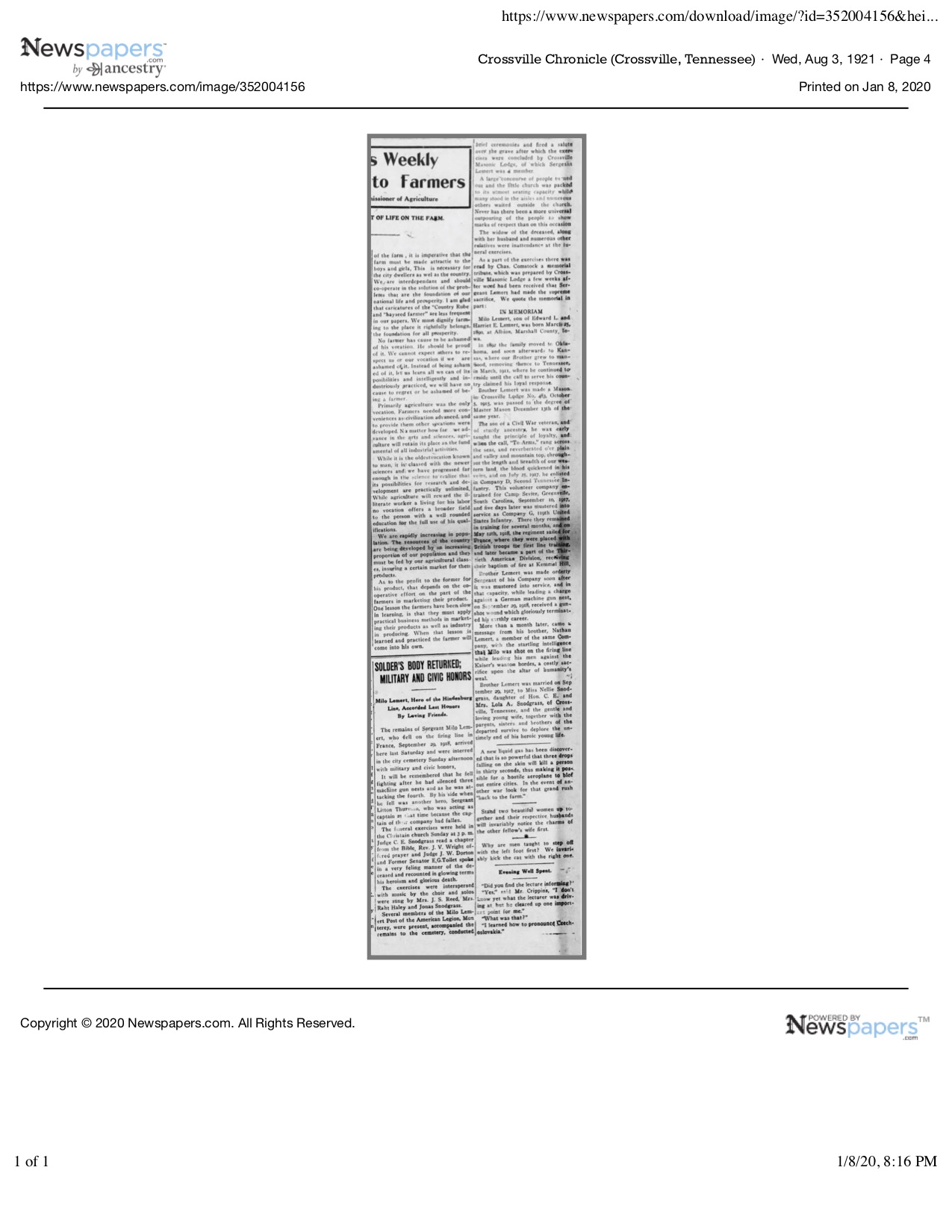 Lemert died heroically on September 29, 1918. Lemert was remembered when the Medal of Honor was presented to his wife of one year at the court house in October 1919. The funeral was held several days later and Milo Lemert was forgotten. For his valor that day, while fighting alongside Lemert, Litton Thurman received the nation’s second highest medal, The Distinguished Service Cross.